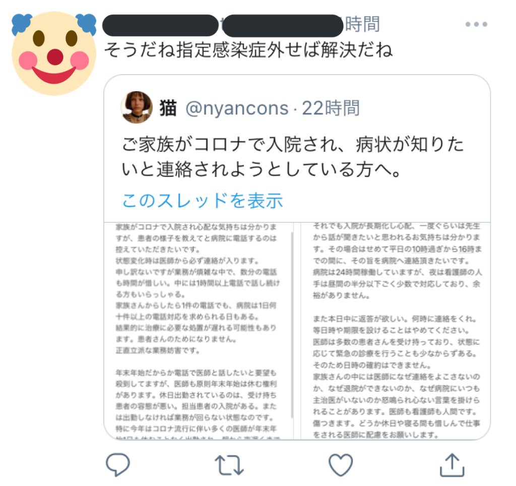 ツイート読む限り、医療関係者の方々の事情は痛いほど理解しております。