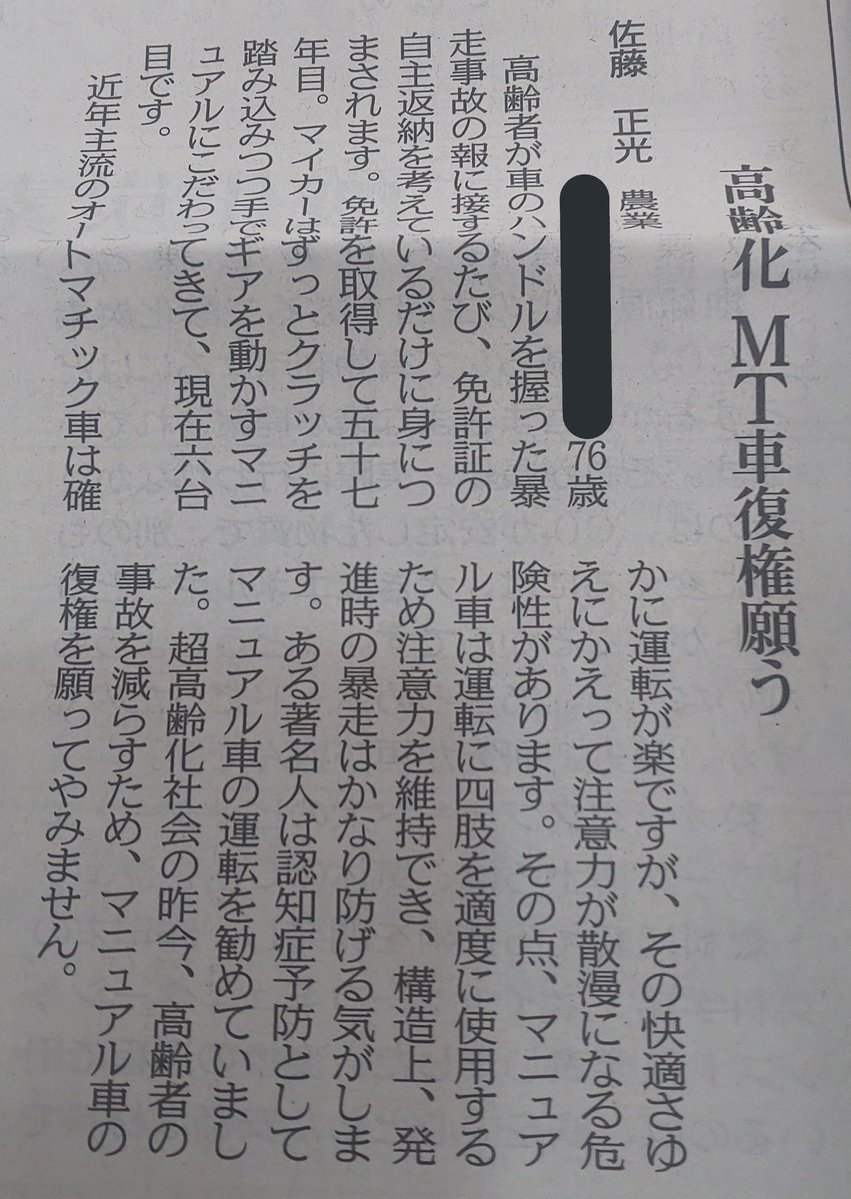 もうね、70歳以上はMT限定にして運転出来ないなら免許返上でいいと思う。ずっとMTだけど運転出来なくなったらきっぱり免許返上しようと思うし最近のは安全装備テンコ盛りのMTもあるからね。まあ今ので事足りてるが性能云々よか乗りたい車種に乗っておきたいっていうのもあるけどそれは贅沢な悩みかな? https://t.co/tvISYOMIqk