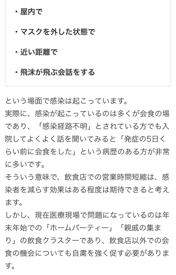 現在医療現場で問題になっているのは年末年始での「ホームパーティー」「親戚の集まり」の飲食クラスターであり、飲食店以外での会食の機会についても自粛を強く促す必要があります。