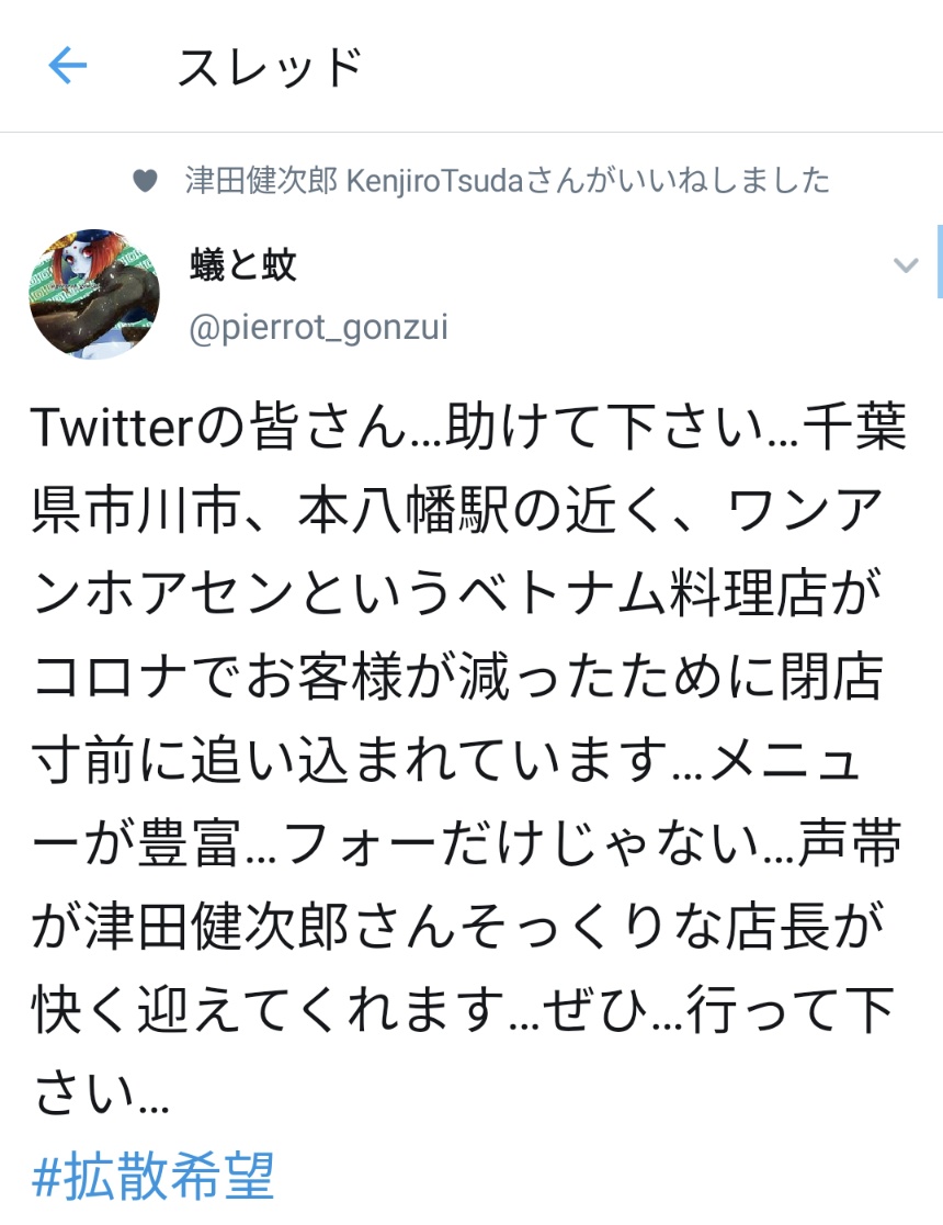 Twitterの皆さん…助けて下さい…千葉県市川市、本八幡駅の近く、ワンアンホアセンというベトナム料理店がコロナでお客様が減ったために閉店寸前に追い込まれています…メニューが豊富…フォーだけじゃない…声帯が津田健次郎さんそっくりな店長が快く迎えてくれます…ぜひ…行って下さい…
