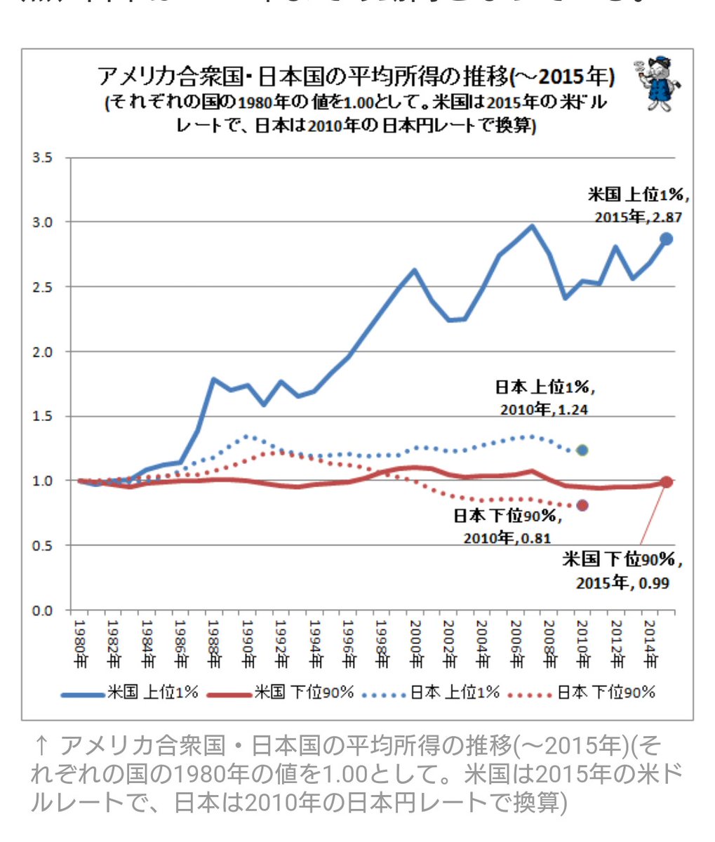 グラフ縦軸に同じ数値を取れば、下位90%は日米ともほぼ同等、上位1%はアメリカが突出しているのが分かる。日本の下位90%の収入が落ちていると見せたいが為の汚いやり方だ。