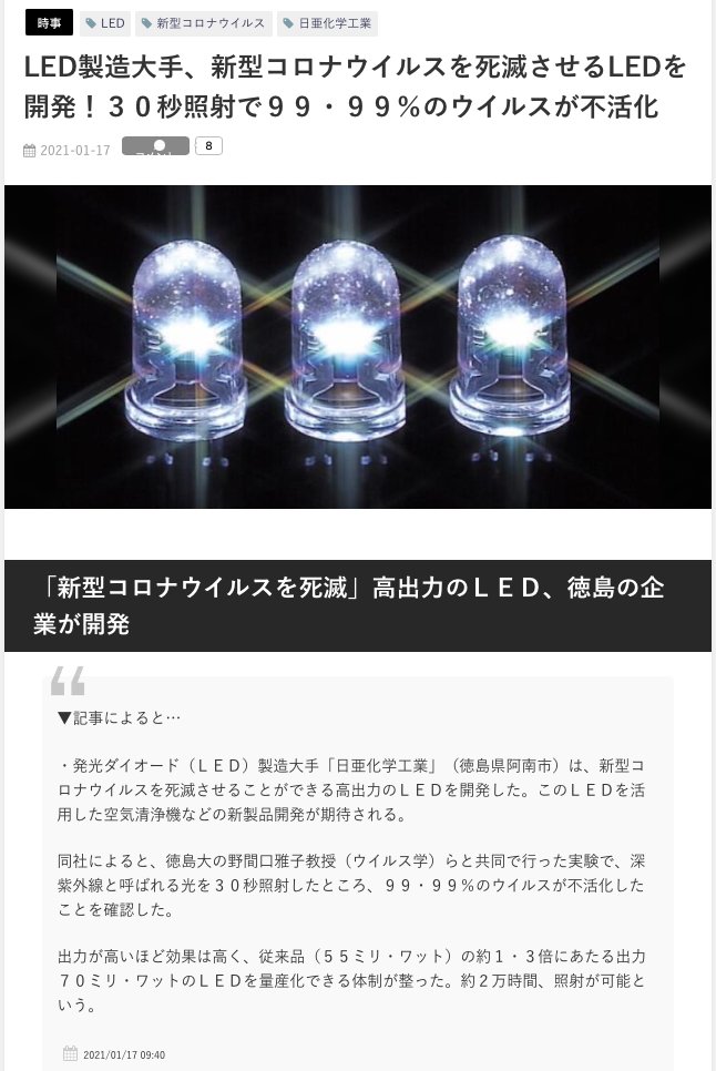 LED製造大手、新型コロナウイルスを死滅させるLEDを開発!30秒照射で99・99%のウイルスが不活化 https://t.co/EJrsWgZPit