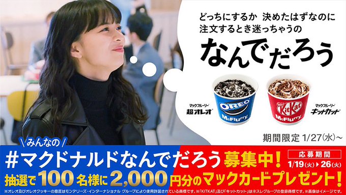 なんですと!あの上國料萌衣ちゃんをCMに起用し期間終了前に早々とSOLD OUTしてしまったマックフルーリーキットカットが今年久々に発売ですと?またCMにかみこだして!
