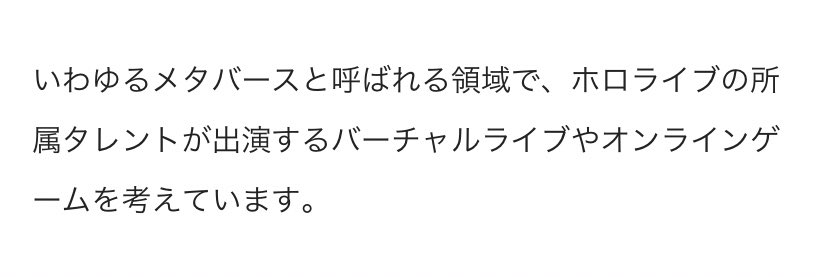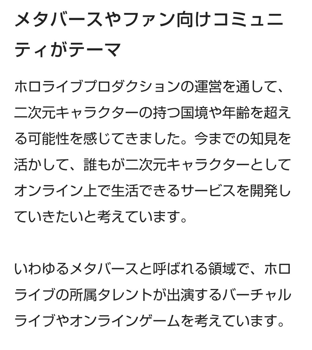 「今までの知見を活かして、誰もが二次元キャラクターとしてオンライン上で生活できるサービスを開発していきたいと考えています。いわゆるメタバースと呼ばれる領域で、ホロライブの所属タレントが出演するバーチャルライブやオンラインゲームを考えています」うおお…!!!