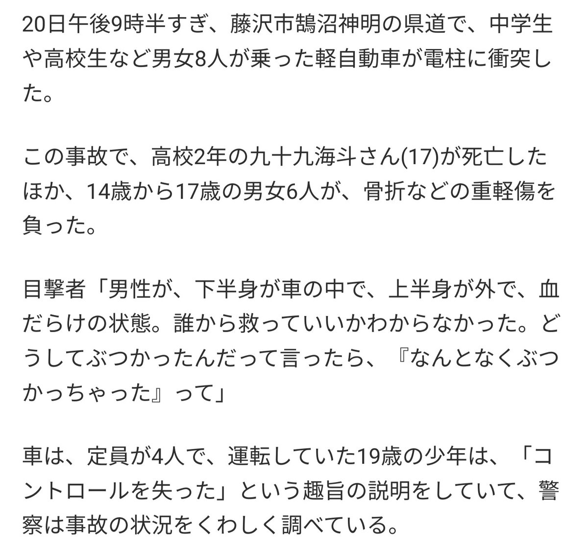 レンタカーで借りた軽に8人乗って、運転手以外全員怪我してて、1人死亡とか、まじで可哀想やけど自業自得としか言えんなぁ。しかもこのメンツの中では最年長らしいし、、