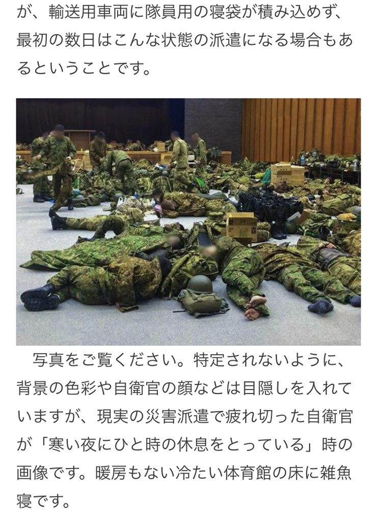 日本の演習場の多くに米軍用の高級な兵舎がありますが、その隣で自衛官は泥水の野営風呂に入り、ぼろぼろのバラックやテントに寝泊まりしている現状を問題視して欲しいですね。