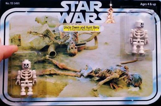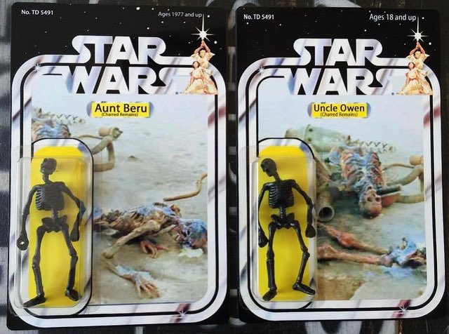 これで思い出したんだけど、登場した直後にストームトルーパーに惨殺されたルークの育て親のオーウェン叔父さんとベルー叔母さんの骸骨が謎の人気を誇っていて色々商品化してるってこれmemeじゃなくてマジなんですかね……?生前の姿で商品化してあげて……?