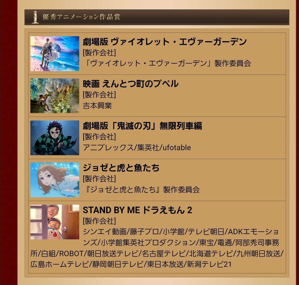 #鬼滅の刃 も #ジョゼと虎と魚たち もノミネートされていない他の作品も、素晴らしいものばかり。