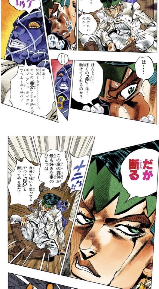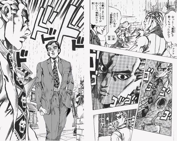 やめとけ!やめとけ!あいつは付き合いが悪いんだ…どこかに行こうぜって誘っても楽しいんだか楽しくないんだか…「吉良吉影」33歳独身 仕事はまじめでそつなくこなすが今ひとつ情熱のない男…なんかエリートっぽい気品ただよう顔と物腰をしているため女子社員にはもてるが会社からは配達とか使いっ走