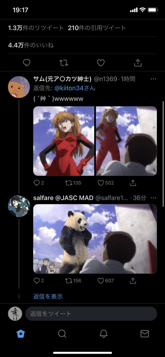 2021.01.30 ツイート maruエヴァのアスカみたいなパンダ見つかるって、見てみたら想像以上にアスカだった。 shiru@エピックセブン@kiiton34エヴァのアスカみたいなパンダ見つかるって、見てみたら想像以上にアスカだった。15:05 – 2021年01月30日返信リツイートお気に入り ツイートに対するネットの反応シン🐈⬛🍁🍠■28ve@shinichi_3001アスカだ19:32 – 2021年01月31日返信リツイートお気に入りこた@東京TL41@kotaaaaaama10「アンタ、バカァ〜?」が脳内再生した19:31 – 2021年01月31日返信リツイートお気に入り九十九@産業革命@igunisukosuko呪術廻戦のパンダ先輩がエヴァにハマったようですね(名推理)19:31 – 2021年01月31日返信リツイートお気に入りひろ@sikinami122289(餌が)遅いのよ!バカシンジ!って言ってそうw19:31 – 2021年01月31日返信リツイートお気に入りエメ、マンウィズ、ドラクエウォークSOAFFお菓子作り、スノボー、料亭巡り、最高級ホテル巡り@doragondemon立ち方かー笑、意味が分かった。19:30 – 2021年01月31日返信リツイートお気に入りJohnny@ARW__46かわいいな、おい19:30 – 2021年01月31日返信リツイートお気に入り山川弘輝@八尋@Yahiro555あんたばかぁ? って絶対言ってる19:29 – 2021年01月31日返信リツイートお気に入り聖エレン@Ellen_Gazerリプ欄が秀逸すぎて一生見てられる☺️19:29 – 2021年01月31日返信リツイートお気に入り 兎夜り@EGOIST____世界初の本物のエヴァンゲリオンなのよ!って言いそう19:29 – 2021年01月31日返信リツイートお気に入りArkerReds@PS4_ARK_あんたばかぁ?19:29 – 2021年01月31日返信リツイートお気に入りFαКer.fbx@Ctrl_Alt_225あんた笹ぁ!?わろたwww19:28 – 2021年01月31日返信リツイートお気に入りオリックスファンの軍曹@proyakyuuaka本物のエヴァンゲリオンなのよ! 制式タイプのね!19:28 – 2021年01月31日返信リツイートお気に入りかねさん コロナに負けないぞ!2021@dream_kanesanあんたバカァ⁉️ @soryu_bot @dere_asuka_bot19:28 – 2021年01月31日返信リツイートお気に入り舞香恵@maikamegumiあのまごころパンダのCM第3弾にいけそう。19:28 – 2021年01月31日返信リツイートお気に入りFANG@イラスト描き&騎空士@FANG1026v予想以上にアスカしとる 「あんたバカぁ?」19:27 – 2021年01月31日返信リツイートお気に入り 継♭-963fam@Megumikato1147アンタバカァ!?19:27 – 2021年01月31日返信リツイートお気に入りラビ🐰🎮MHRise待機🎮デジボク🎮ボーダーランズ3@erika_rabiほんとだwww🤣19:26 – 2021年01月31日返信リツイートお気に入りK2 #ぽんこつ信者 #観測者 🌂️✂️ #凛fam #ホロ箱@beyondthemoon10呪骸やんけ19:25 – 2021年01月31日返信リツイートお気に入りぴーまん@Gj6aD7あんたばかぁ?とか言ってきそう19:25 – 2021年01月31日返信リツイートお気に入り架瑞🦋೭ᘏᗢ🦋@kazui_jyobaあのセリフが聞こえてくる、マジでwwww19:24 – 2021年01月31日返信リツイートお気に入りひできち@きいち@hidekiitiかわいい19:24 – 2021年01月31日返信リツイートお気に入り岡勝雄withカタリナ騎士@1togetkuro餌やりは無駄なく美しくよ(ドヤァ19:23 – 2021年01月31日返信リツイートお気に入り kimika、Q days to go@KimikaXxx「あんたバカァ!?」的なwww19:23 – 2021年01月31日返信リツイートお気に入りいとまき@winter1999555あんたカバァ!?19:21 – 2021年01月31日返信リツイートお気に入りLEFT@left_01確かにあんたバカァ、と聞こえた、、、19:21 – 2021年01月31日返信リツイートお気に入りAIR@エヴァ廃@Licht_mikuカラーリングは赤にしてよねっ!19:21 – 2021年01月31日返信リツイートお気に入りモスコミュール@takutaku0412あんたバカぁ〜?て言ってるなコレ19:20 – 2021年01月31日返信リツイートお気に入り蜜柑@2021年よろしくお願いします🐮@michel808可愛い💕パンダ見に行きたい^ – ^19:20 – 2021年01月31日返信リツイートお気に入りセナ@neongai12あんたバカァ~⁉️って言ってそう(笑)19:20 – 2021年01月31日返信リツイートお気に入りヤギノブヒコ@yagi_larkotm初めてパンダ可愛いと思った19:20 – 2021年01月31日返信リツイートお気に入りYUKI@人生迷走中@U24_goldあんたバカァ!?って聞こえてくる19:20 – 2021年01月31日返信リツイートお気に入りフォンセ(原神聖遺物周回週間)@fonse_1117この流れでダメだったw https://t.co/zuQKR0Q07O 19:18 – 2021年01月31日返信リツイートお気に入り外人さん(🔥⚙️)@hosoe_officialあんたパンダァ!?19:18 – 2021年01月31日返信リツイートお気に入りHachi❂奇行士な土下座ムライ@Hachi_purio「あんたバカァ!?」19:18 – 2021年01月31日返信リツイートお気に入りまぐ太郎@hw2DiDpjs9Q8jCB完全に「あんた馬鹿ぁ?」が脳内で再生される🤣19:16 – 2021年01月31日返信リツイートお気に入りとまとおでん@pumpking113パンダ「まだ?」19:13 – 2021年01月31日返信リツイートお気に入りツボボン@GOREDSSWA23コレは、アスカだね19:13 – 2021年01月31日返信リツイートお気に入りもりくぼきー@kubo_kimiアンタカバァ?19:12 – 2021年01月31日返信リツイートお気に入りsakura 原稿をしろ@sakuran0318リプ欄の最初2つくらい読んで。草19:12 – 2021年01月31日返信リツイートお気に入りなみへい。@AKB748アスカに会いたい19:12 – 2021年01月31日返信リツイートお気に入り