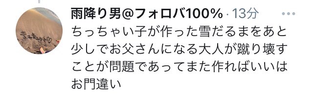 ちっちゃい子が作った雪だるまをあと少しでお父さんになる大人が蹴り壊すことが問題らしいこの記事の主題を掴みきれなかった現代文弱者ワイ https://t.co/KrKpk6o0Tv