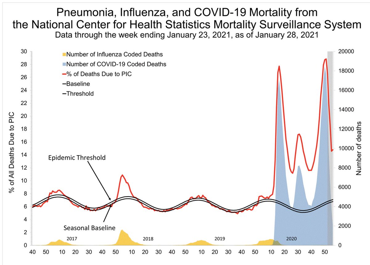 アメリカは昨シーズンは全然抑えられなかったけど今シーズンはさすがに抑えてる(インフルによる死者数、黄色)。COVIDによる死にっぷり(青色)も半端ないけど。 https://t.co/p90h0lwFFS