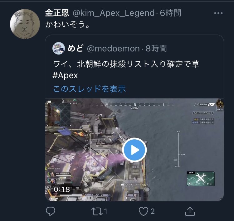 2021.02.03 ツイート maruワイ、北朝鮮の抹殺リスト入り確定で草 #Apex めど@medoemonワイ、北朝鮮の抹殺リスト入り確定で草 #Apex23:48 – 2021年02月03日返信リツイートお気に入り ツイートに対するネットの反応にっく⊿@niku_exvsこれくっそ笑ったwwwwwwwwwwww01:15 – 2021年02月05日返信リツイートお気に入りなぽりたん!@routes3910草00:31 – 2021年02月05日返信リツイートお気に入り˙˚ʚ 윤 ɞ˚˙@meru39mira金正恩ワロタ(*´ 艸`)笑 思わずこの動画を見てしまいました(´・ω・`)笑23:35 – 2021年02月04日返信リツイートお気に入りあおか@ブンブンエイム猛者@aokadesudesuわらったわw22:04 – 2021年02月04日返信リツイートお気に入りりんご@ライティングマン@Apple_Tea_Xlk被せてくる味方が悪すぎるな…wwピン刺さないのも相まってただの害悪レベル..wwww20:45 – 2021年02月04日返信リツイートお気に入りArcueid@魔人BS教教祖@JONSOOOON114514日頃の行いが悪いから死ぬんだよ()19:43 – 2021年02月04日返信リツイートお気に入りちゃんエリ🤡@chan_eri731金正恩~🤣この人残念やけどVXガスで抹殺されるわ。19:37 – 2021年02月04日返信リツイートお気に入りミラージュアたまご@MirageATamagoこれは日本に戦争仕掛けられてもおかしくないな。19:30 – 2021年02月04日返信リツイートお気に入り ムラコ@nao56671063これ、笑えるw19:28 – 2021年02月04日返信リツイートお気に入りボンゴレロッソ@peroci_Kこれは…….死刑確定演出やな…….19:19 – 2021年02月04日返信リツイートお気に入りいよ@iyo416オクタン「すげぇ!!最高だったぜ!!」19:17 – 2021年02月04日返信リツイートお気に入り✤ Folium ✤@Folium88145419草19:12 – 2021年02月04日返信リツイートお気に入り金土日総書記@GeneralFriSatSu祖国反逆罪19:01 – 2021年02月04日返信リツイートお気に入りRion@@Re_onRavenいや草18:58 – 2021年02月04日返信リツイートお気に入りかなちゃん@RiskyBバケツの底丸見えポテト@RiskyBlack1596草生えた18:52 – 2021年02月04日返信リツイートお気に入り チャチャ丸@ChoCo_MaRu2むしろ金正恩の名を騙って無様な死に方してるオクタンニキが抹殺されそう18:51 – 2021年02月04日返信リツイートお気に入りカニドン@Kanidon951357声出たw18:37 – 2021年02月04日返信リツイートお気に入りしず〆さん。@shizuesan123shi腹痛い18:31 – 2021年02月04日返信リツイートお気に入りぺるかさ🍴@Perkasadayo吹いたww18:15 – 2021年02月04日返信リツイートお気に入り雛@hinaruna0906ワロタ🤣18:12 – 2021年02月04日返信リツイートお気に入りもももみしあ🍒ゆらゆらブラッドレッド🍒@momomo_chnzこれはまさか…いやまさかな…18:10 – 2021年02月04日返信リツイートお気に入りちろまる(こばと)@chiroru_cobatoレイスの頭で滑ったんかな・・・17:51 – 2021年02月04日返信リツイートお気に入り Emera19【一般】(2/19/2021までFiNALE TESTの為AC音ゲー休止中)@Emera19_NCN大丈夫大丈夫僕なんか中国政府に監視されてっから(おい何した)17:48 – 2021年02月04日返信リツイートお気に入りべるちゃあああああああああ@MK250731103金正恩草17:41 – 2021年02月04日返信リツイートお気に入り風見@kazamimemoこれは迫撃砲で粛正されてまう・・17:39 – 2021年02月04日返信リツイートお気に入りN α t s u m i .@k_ntm_これほんまくさ17:38 – 2021年02月04日返信リツイートお気に入りミヤ@Oshino008719クソワロタ17:36 – 2021年02月04日返信リツイートお気に入りブロフンのカラス@GbYtGpiwTDmrlepシェアハウスニキに制裁をwww17:34 – 2021年02月04日返信リツイートお気に入り通りすがりの猫@cats_1985キムジョウウン!がはははは好き17:29 – 2021年02月04日返信リツイートお気に入り強いキムチ@KimuchiKimoti火の海にする17:28 – 2021年02月04日返信リツイートお気に入りそらくん@こんばんは。@sorakunOwO落ちたところ一緒で草 斜めから行くのやめような^^17:24 – 2021年02月04日返信リツイートお気に入りkitakitune 今日誕生日@KitakituneMやっちまったな……17:20 – 2021年02月04日返信リツイートお気に入りさきゅ@🐥1y4m&🥚8月4日予定🎂@Sakiyu__声出て笑った17:10 – 2021年02月04日返信リツイートお気に入りヤマサ@YES_lulucanこれは草17:03 – 2021年02月04日返信リツイートお気に入り京急つぐみ@keikyuu_tugumiヒットぉ!w16:35 – 2021年02月04日返信リツイートお気に入りなお@82naoto金正恩痩せたなぁ16:25 – 2021年02月04日返信リツイートお気に入りさやピレちゃんおだ@pnp_ktkrいやお腹痛すぎ金正恩オクタンやめれwwww16:15 – 2021年02月04日返信リツイートお気に入り聖來っさん@yuto092000wwwwwwwwwwwクソ笑った15:15 – 2021年02月04日返信リツイートお気に入りヨモギ@復帰 語尾(/・ω・)/にゃー!@yomogi140411(´^д^`)ワロタ (/・ω・)/にゃー!15:15 – 2021年02月04日返信リツイートお気に入りたけぽん@takepon_000わろた🤣15:15 – 2021年02月04日返信リツイートお気に入りいぶ@トマトジュース生活@zero0_428普通に笑ったww15:11 – 2021年02月04日返信リツイートお気に入り赤葦京治(たかはち)@IQ114514_ともだちになりたい14:56 – 2021年02月04日返信リツイートお気に入りれゆんちゃん❕@a___ririmoO声出して笑ってしまったやんこんなんずるいてwww14:51 – 2021年02月04日返信リツイートお気に入りカ