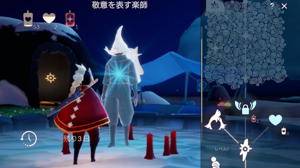 再訪する精霊が告知内容と異なる不具合が発生していましたが、現在は解消されました。正しい精霊と会えない場合は再起動をお試し下さい。誤って登場した精霊は次回正規に再訪しますが、既に解放された持ち物等はそのままご使用頂けます。大変失礼いたしました。#thatskygame