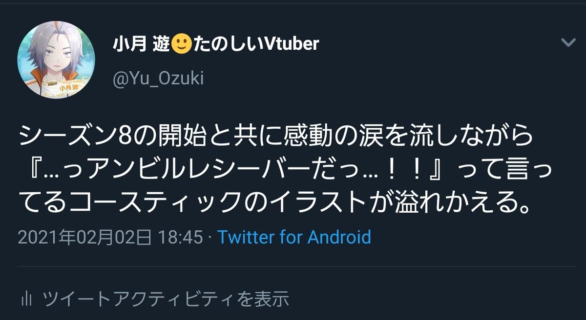 2021.02.05 ツイート maruアンビルレシーバーだ! ミズ@mizu_cxアンビルレシーバーだ!11:00 – 2021年02月05日返信リツイートお気に入り ツイートに対するネットの反応積み木くずし@幻想廃人@tmk_PomatOしょっちゅう色んな人がガスおじのアンビルレシーバーをネタにしてたからすごくワクワクしてたんだけど、本当にそこだけ様子がおかしくて草生えたww14:26 – 2021年02月05日返信リツイートお気に入りツムギ@sgs_tugutumugiこれよ、これ14:22 – 2021年02月05日返信リツイートお気に入りディア@BLACK_DEVILGAME感動の再開笑笑14:21 – 2021年02月05日返信リツイートお気に入りキングスキャニオン@kim_san1030ずっと側にいてくれたのか…導きのアンビルレシーバー…14:17 – 2021年02月05日返信リツイートお気に入りエレンさん。@Roselia推し@GE_Erensanいつかディスラプター弾も帰ってこないかな14:14 – 2021年02月05日返信リツイートお気に入りらて。@R9684159懐かしいwww14:14 – 2021年02月05日返信リツイートお気に入りTATTU-KUN@StrongLiveTattu聞けてしまうのか14:12 – 2021年02月05日返信リツイートお気に入りぽん@PoNNN_PS4脳内再生余裕でしたwwww14:04 – 2021年02月05日返信リツイートお気に入り キリ@kiri030612絶対誰か書いてくれると思ってた! ありがとう。 最高すぎるww,13:59 – 2021年02月05日返信リツイートお気に入りふっふーおじさん@fuffuuuojisanコースティックでピン差す時毎回笑ってしまう13:53 – 2021年02月05日返信リツイートお気に入り🌰無能りんたろ🍰@Linmarronすきwwww13:52 – 2021年02月05日返信リツイートお気に入りばりょ㌠@baryo3teamだいすき13:49 – 2021年02月05日返信リツイートお気に入りサプト MBHR@saputo765この人の書くコースティックほんま好き13:44 – 2021年02月05日返信リツイートお気に入りオムぅ@KNJ52094178このネタ好きww 最初見た時もお茶吹いた(´▽`*) #APEX13:39 – 2021年02月05日返信リツイートお気に入りどまるちゃん🍑前の名前はプロフに🌟@Ne_3_suzuすきw13:35 – 2021年02月05日返信リツイートお気に入り ふりすか【ナメクジです。】@Friska_RaVこれが好きでコースティック使い始めたまである(笑)13:34 – 2021年02月05日返信リツイートお気に入りこーぴー@CoooPyyyこれ聞いたことないので誰か今度ガスおじ使ってくださいお願いします13:34 – 2021年02月05日返信リツイートお気に入りぽんこつくまさん( ´བ` )@ku_ma414おまめさんだ!13:33 – 2021年02月05日返信リツイートお気に入り波多見いずも🌲バーチャル森の民@hatami_izumoようやく聞けてうれしい13:27 – 2021年02月05日返信リツイートお気に入り謎のロットロx(オルタ)@takutakumk2アンビルレシーバーだ!13:19 – 2021年02月05日返信リツイートお気に入り✵チャッピー✵@Primula_Juliana恐らくまだポップアップとかわかってないうちに無くなってたから アンビルレシーバーがどんな力を持ってるのか把握してないw13:17 – 2021年02月05日返信リツイートお気に入りLaa@lqby19帰ってきたぜ 俺たちの… アンビルレシィバァだっ!!13:15 – 2021年02月05日返信リツイートお気に入り チャリしろ@rssjheこれを待ってた13:13 – 2021年02月05日返信リツイートお気に入りMAA(まー)@ローバ専@maa__musicこれ今日帰ったら聴いてみようww そんな迫真のアンビルレシーバーなの?w13:13 – 2021年02月05日返信リツイートお気に入りさむ☻きす(・´`(●)@kys0sam「アンビルレシーバーだ!!!!」言いたくて使わないのに探しちゃう😂13:12 – 2021年02月05日返信リツイートお気に入りベりぃ@Berry_nz3待ってました!w13:11 – 2021年02月05日返信リツイートお気に入りあやの@pink_2pink_pinkこの時めちゃめちゃ好き13:10 – 2021年02月05日返信リツイートお気に入り怠惰なバンギャのみずぱふ@rinrin_3sやっぱみんな好きなんだね、アンビルおじさん13:08 – 2021年02月05日返信リツイートお気に入りきつね ♂3NS@OddeyeFox_Ghostまたこれが聞ける環境になりましたね🤣13:05 – 2021年02月05日返信リツイートお気に入り灯ルよしこ@hdm5296これずっと思ってた(笑)「アンビルレシーバー」って言う時だけめっちゃテンション上がるガスおじ面白い🤣13:01 – 2021年02月05日返信リツイートお気に入りchisaな世界(It’s a small world)@chanchii091174これの為に ガスおじ使いたい( ¯꒳¯ )12:59 – 2021年02月05日返信リツイートお気に入りAVL Ryu-99Mw@Masyu_hobbyコースティックせんせー!!!12:53 – 2021年02月05日返信リツイートお気に入り藍苺/Aichi@パンダ好きVtuber@Aichi_pndこれ好き12:49 – 2021年02月05日返信リツイートお気に入りヤンクミ@ship4@yankumi_sendaiやっぱガスおじにはこれが必要だよ12:45 – 2021年02月05日返信リツイートお気に入りむーふぁ@mu___fafafaやっぱみんなこれ思うよねwww12:43 – 2021年02月05日返信リツイートお気に入りエルヴァ@ELVA0907やっぱあの台詞引っ掛かる人おるよなw12:39 – 2021年02月05日返信リツイートお気に入りᗦ↞︎◃︎@Osakana_231待ってたよ^^12:38 – 2021年02月05日返信リツイートお気に入りP-chan-mu 🍊🐹🐱🌪@P_chan_muこの人のアンビルレシーバーだ!を再び見れると期待してたらやっぱり笑笑12:37 – 2021年02月05日返信リツイートお気に入り掃除屋@soujiya414泣いた12:35 – 2021年02
