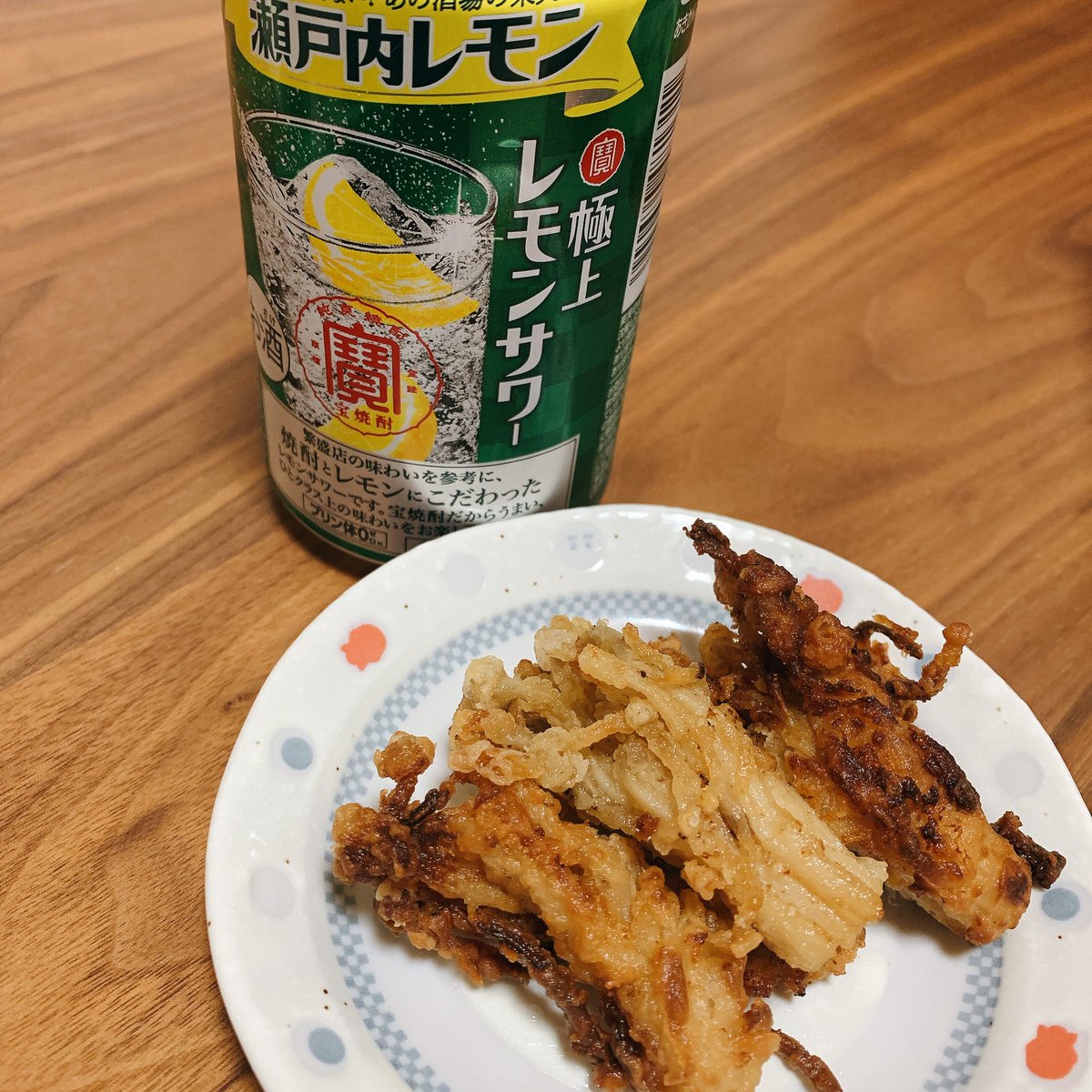 ②フライパンにサラダ油大さじ4を入れ、中火でえのきを揚げ、キツネ色になったら完成!