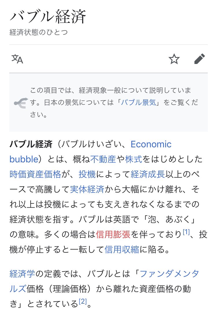 定義からいうと資産価格の高騰さえしてればバブルらしいけど、今回が平成バブルと違うのは信用膨張(要は借金して投資)がないこと、得た利益が消費に回らないので生産が起きないこと