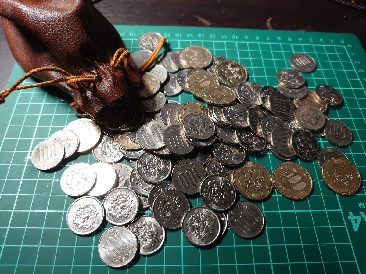 ナイスアイディア笑。以前500円貯金した時はHAPPYBEARのくまちゃんボトル満タンにして銀行窓口に持って行ったから重いし何だか恥ずかしいしで大変だった。壊れちゃったから貯金箱にしてるけど、革袋もいいなー♪