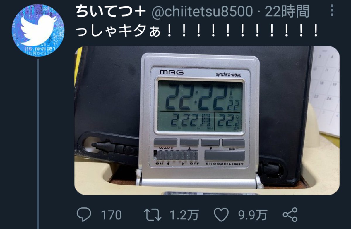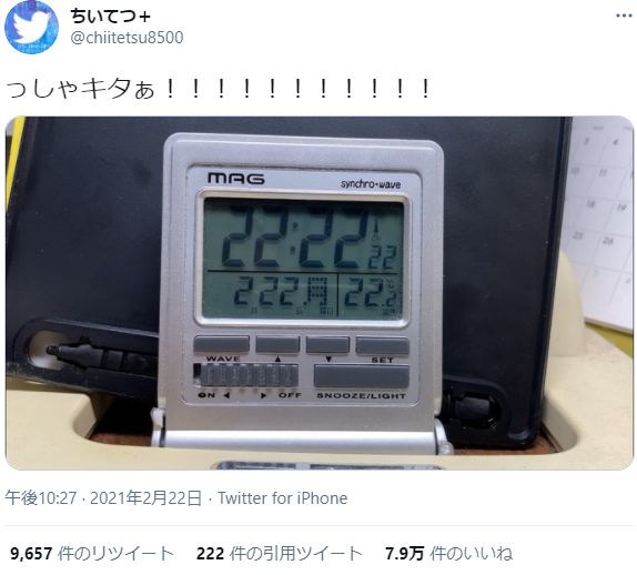 私が見た時は引用ツイートの数まで222で揃ってた。来年揃えたら2222年で更に凄い事に。 https://t.co/cRe6Lteot2