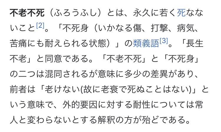 不老不死と不死身は現代ではよく混同されるけど、不老不死は「老けない(故に老衰で死ぬことはない)」ということなので怪我などの外的要因で普通に死ぬ。って古文か漢文の授業で先生が言ってて個人的10へぇでした。
