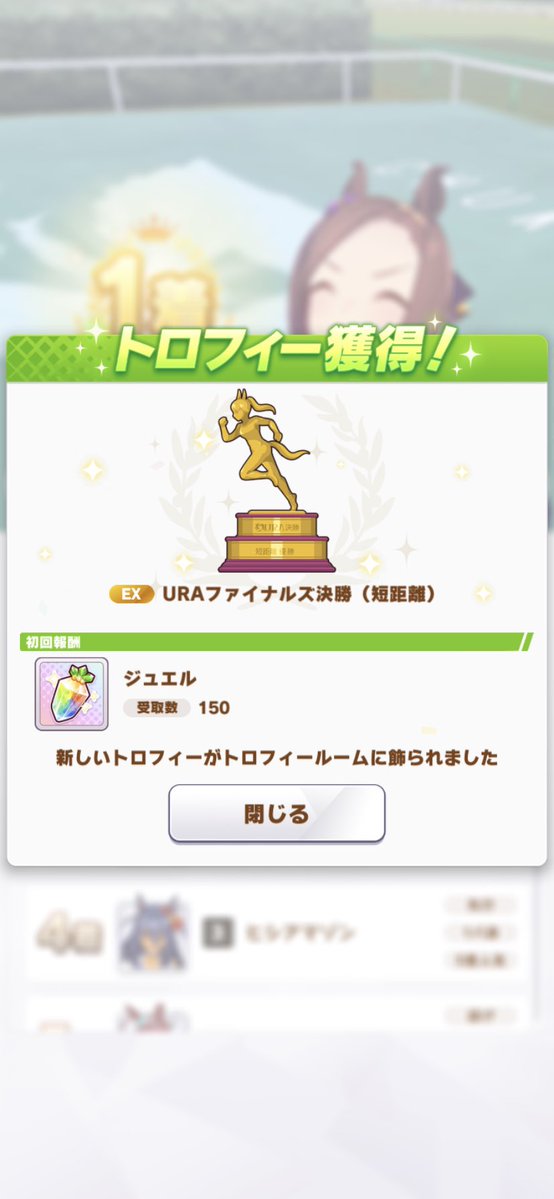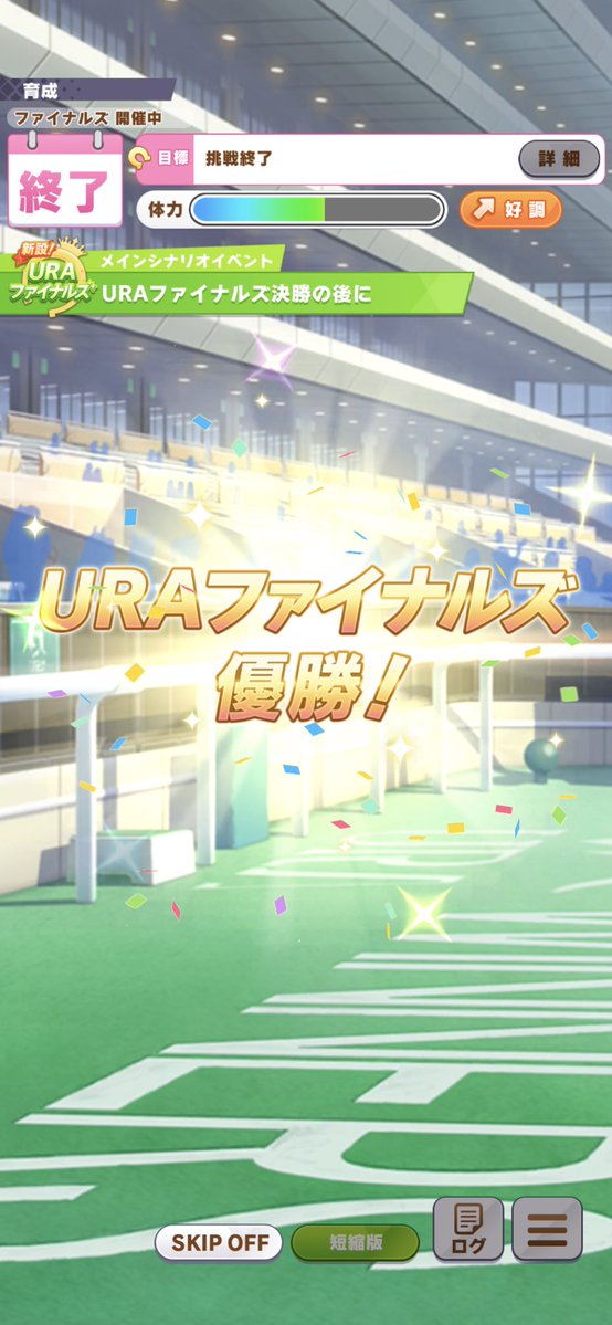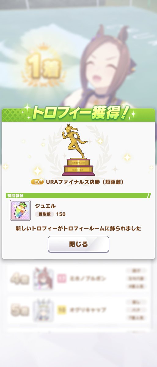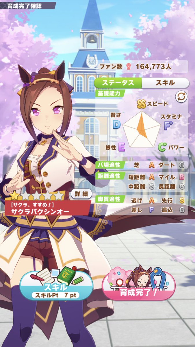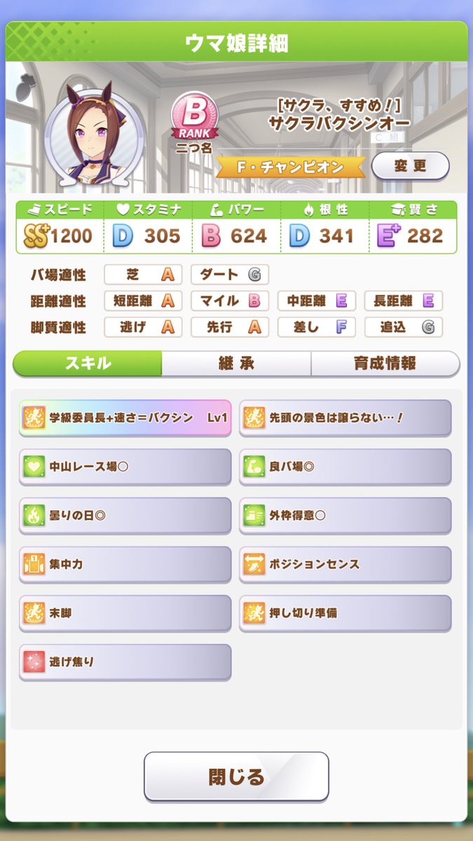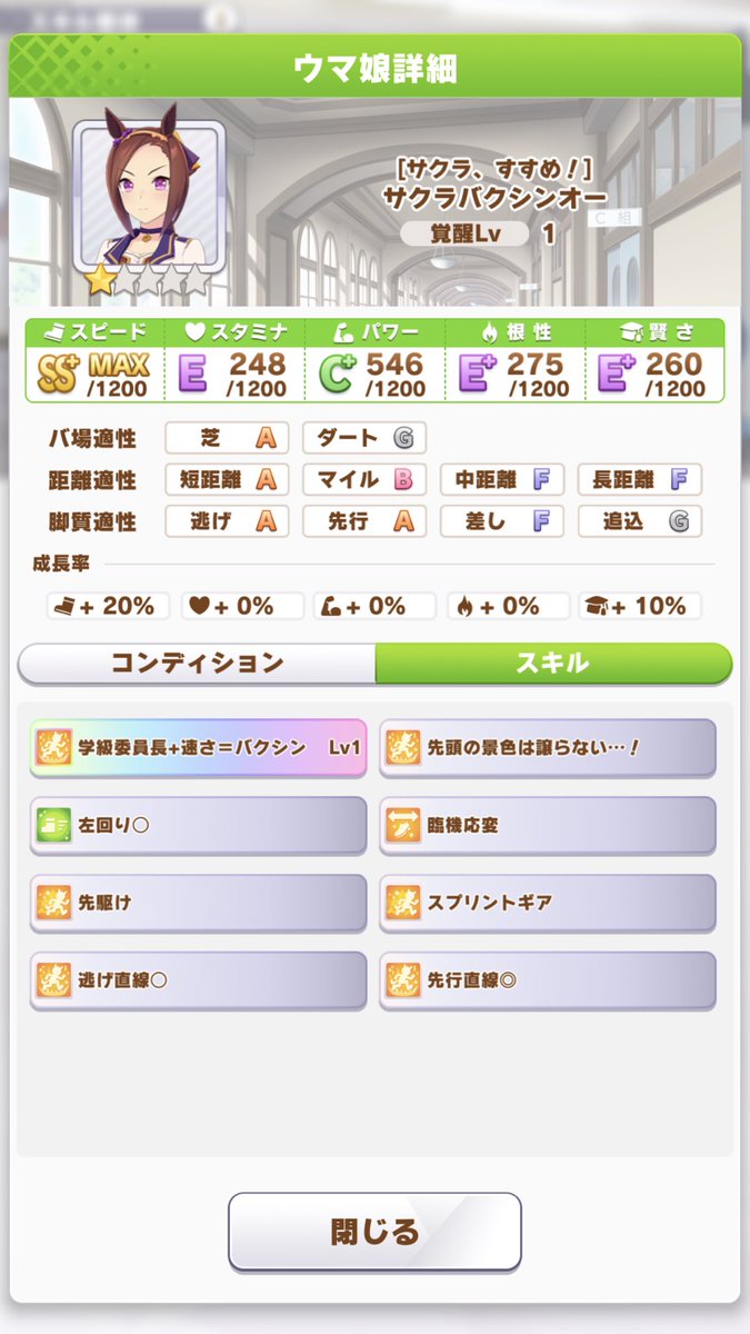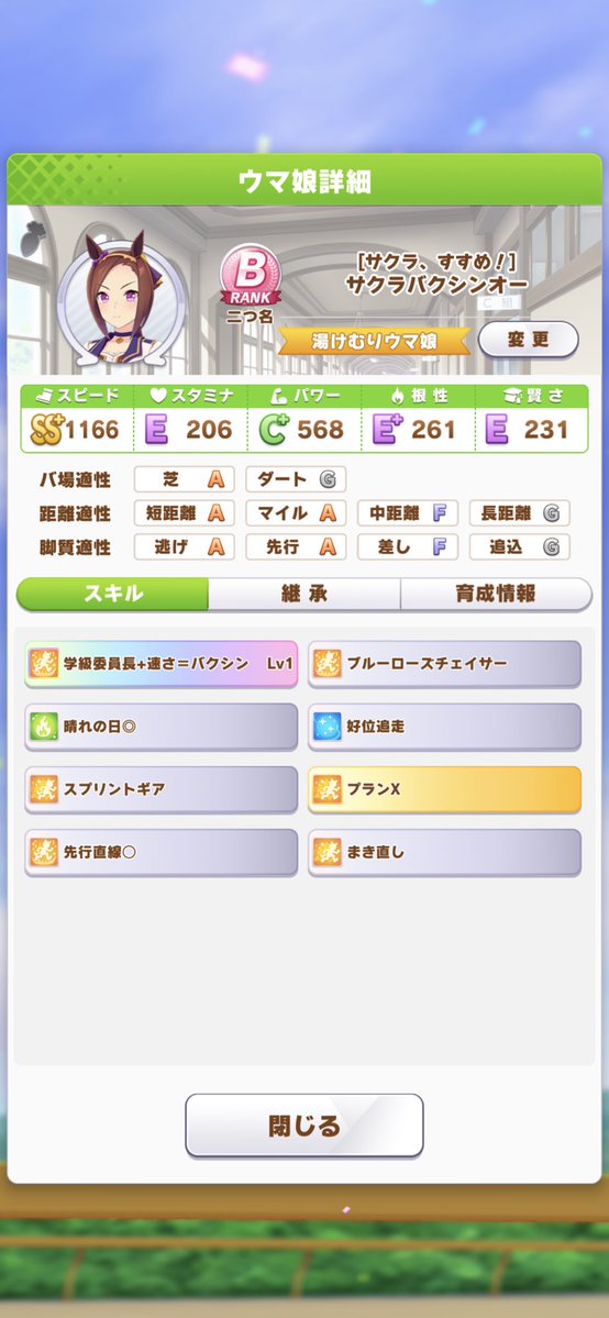 バクシンオーでスピード強化のみにスピード・スタミナ系のスキル取ったらレース全部一位で最後も勝てたすごい…(最後はリトライ2回した