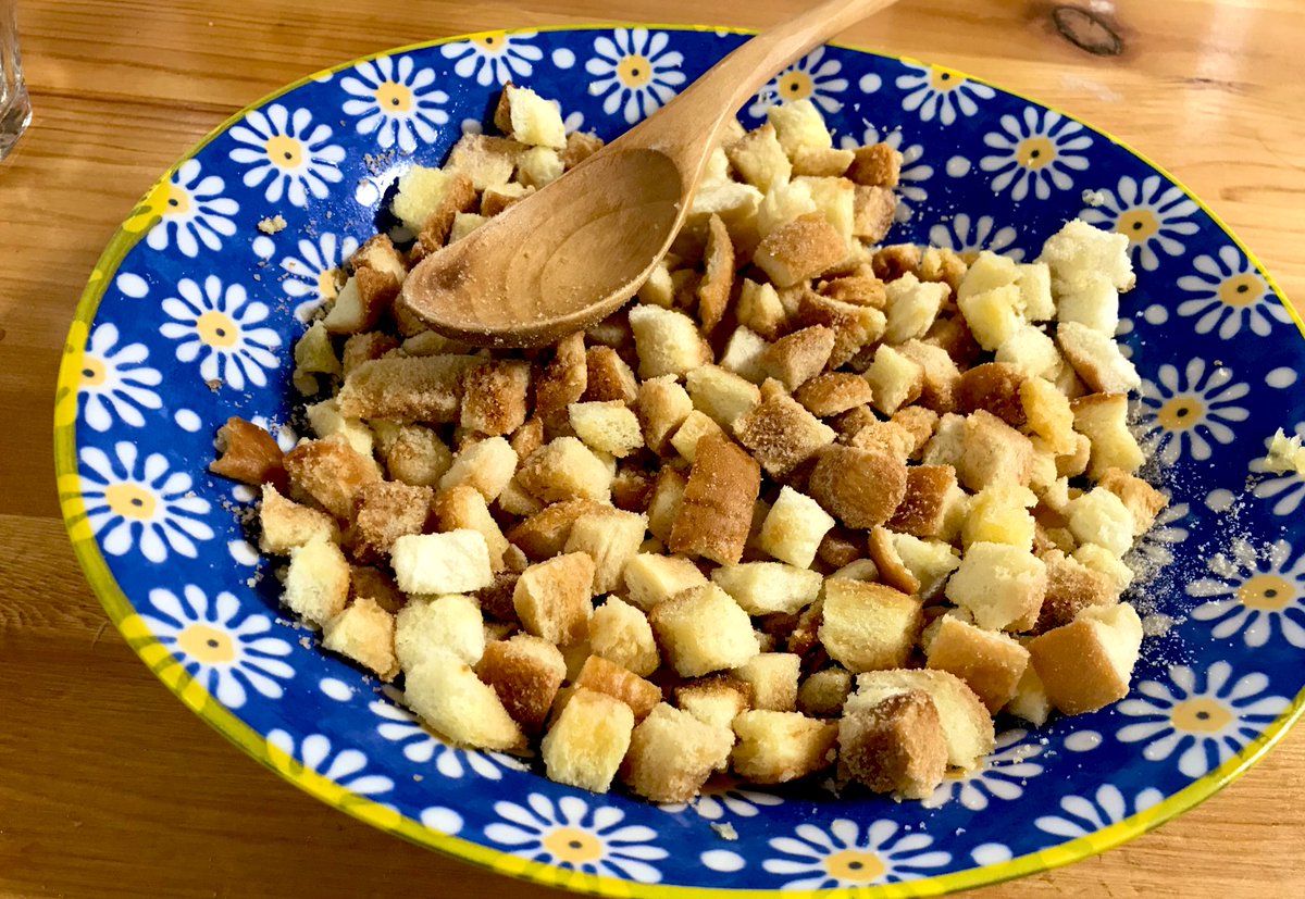 6枚切り食パン1枚を1cm角に切り600W1分半チンし、バター20g絡め更に30秒チンし混ぜたら、カリカリになるまで「30秒加熱→混ぜる」を繰り返し砂糖大1を絡める。