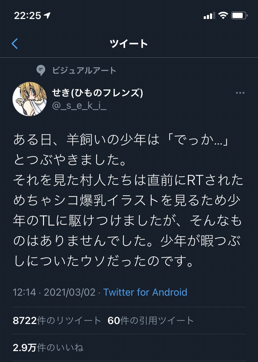 2021.03.02 ツイート maruそれを見た村人たちは直前にRTされためちゃシコ爆乳イラストを見るため少年のTLに駆けつけましたが せき(ひものフレンズ)@_s_e_k_i_ある日、羊飼いの少年は「でっか…」とつぶやきました。 それを見た村人たちは直前にRTされためちゃシコ爆乳イラストを見るため少年のTLに駆けつけましたが、そんなものはありませんでした。少年が暇つぶしについたウソだったのです。12:14 – 2021年03月02日返信リツイートお気に入り ツイートに対するネットの反応結奈@ネオロマンスHYPER MIXライヴ!@TomaYuuna嘘も何もその一言でその発想になる村人達がヤバいww デカい犬かもしれないしデカい野菜かもしれない。19:20 – 2021年03月03日返信リツイートお気に入りヘタレンノ@noSkoyukiこれやろうとしたけど僕のTL、エロ画像しかなかったから意味なかった08:34 – 2021年03月03日返信リツイートお気に入り色々愛してる人🎈@Preasdisneyビジュアルアート枠として流れてきたのほんと草 https://t.co/Qks1ib2qZQ22:28 – 2021年03月02日返信リツイートお気に入り篠🔞 孕妇癖注意@milkyismomstasおちんちん想像した22:25 – 2021年03月02日返信リツイートお気に入りさと@satone_310オオカミ少年で草22:06 – 2021年03月02日返信リツイートお気に入りヤンデレぬかりん@nukari_k磔刑だな少年21:58 – 2021年03月02日返信リツイートお気に入りヘキサアイズ@HexaEyesとてもかなしい嘘21:38 – 2021年03月02日返信リツイートお気に入り煌@kou7024斧を持て20:22 – 2021年03月02日返信リツイートお気に入り 小野寺広目天(神崎亮介)@ond_koumokutenちんちんだと思っちゃったよオイ19:45 – 2021年03月02日返信リツイートお気に入り赤毛コンプレックスあんこ@AnkoKawaiiyo少年がデカマラキモオジに掘られてる写真でるまで更新をやめない()18:52 – 2021年03月02日返信リツイートお気に入りゆぅぅぅ⚡️先生@Bonga_kurokuroこれたまにやる18:30 – 2021年03月02日返信リツイートお気に入りキリ@18禁呟き注意!@axion_aird許されない18:26 – 2021年03月02日返信リツイートお気に入りダギリオダギレイ@tapiyes俺ならデッカレコードだと思います()()18:21 – 2021年03月02日返信リツイートお気に入り近衞騎兵@ranzoshaイギリスのかアメリカのか、ちょっと気になる。>> Decca (違18:18 – 2021年03月02日返信リツイートお気に入りルキアノヴェナトル@Lucianovenator天才がいる…18:09 – 2021年03月02日返信リツイートお気に入り スーパーゆっすぃ@superyushi1666繰り返しすぎて羊飼いが本当にRTしても誰も見に来なくなるパターンだ…17:53 – 2021年03月02日返信リツイートお気に入りじんじゃーらる@花粉死ね@raru160えち絵を独占する高等テクニック17:38 – 2021年03月02日返信リツイートお気に入りShioN@ShioN_Lapras「でっか…」と呟く人は引用リツイートで呟く義務があります。Twitter歴の浅い人は分からないと思いますが、覚えておきましょうね💢17:30 – 2021年03月02日返信リツイートお気に入りムーミン毛玉@motoraiV3これチンコの可能性もあったんじゃないの?17:06 – 2021年03月02日返信リツイートお気に入りSCPになったにゃんこ🐀🕗♿🍎💜🌱💙(正式名称 ねこデス)@Ycwm7wcXyquaxj0本物のイラストを見つけても誰にも邪魔されないという策士だ…16:28 – 2021年03月02日返信リツイートお気に入りらみ(48/1127)💤@lamy_padなんか予言してて草16:19 – 2021年03月02日返信リツイートお気に入りグリーン・ウイロウ@SpicaTrain999ブルックリン・デッカー16:16 – 2021年03月02日返信リツイートお気に入り しょんご@sng_ika少年のこと許せないかもしれん16:09 – 2021年03月02日返信リツイートお気に入り3月から定職につくア・ライさん@chuutonaarai関西人の羊飼いかと思ったのだ15:37 – 2021年03月02日返信リツイートお気に入り危険思想 VeR.2@KidTver2最終的にとんでもない爆乳に襲われるショタ少年が見える15:33 – 2021年03月02日返信リツイートお気に入りはねおか@haneoka0707死刑にしろそんなクソガキ15:17 – 2021年03月02日返信リツイートお気に入り石兵【せきへい】@sekihei_acgplay最後爆乳に襲われて誰も助けに来ないなら試す価値あり15:08 – 2021年03月02日返信リツイートお気に入りなぎせ ゆうき@nagise羊飼いの少年(ダビデ)がゴリアテと対峙した話ですね🤥 https://t.co/tLWaGf8bNm15:06 – 2021年03月02日返信リツイートお気に入りただの事務員🔞𓂺@NTTW_piyo騙したなっ!!!15:01 – 2021年03月02日返信リツイートお気に入りぎんぞう@ginzowリアル羊ちゃんの爆乳なら許す13:38 – 2021年03月02日返信リツイートお気に入りいしかわくらんど@ishikawakurando「大変だー!残り一割の可能性だった本物の時間停止AVが発売されたぞー!!」13:37 – 2021年03月02日返信リツイートお気に入りちーぽんぬ@hamamen4545これは許されない…13:32 – 2021年03月02日返信リツイートお気に入り火燐@rinrincatP15(爆乳)オオカミ(娘に襲われる)少年13:28 – 2021年03月02日返信リツイートお気に入りあppぇ¥@Essen_Apfelいいね欄もみよう13:15 – 2021年03月02日返信リツイートお気に入りむあ@幻の白髪ジブ@muaAKi本筋と違う話になるけどこういう事があるから、感想は引リツで付けるべき13:05 – 2021年0