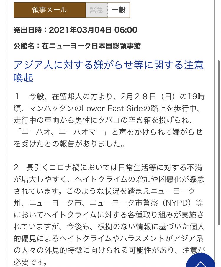 領事館からのメールで「アジア人ヘイトクライムが増えているので、肌を出来るだけ覆って人種が分からないよう心掛けて」って来てたけど、何も後ろめたいことがあるわけじゃないのに自分のルーツを隠さないと安心して生きてけないって凄いストレスよね。これが自由と多様性の象徴と謳われたNYの現状と。