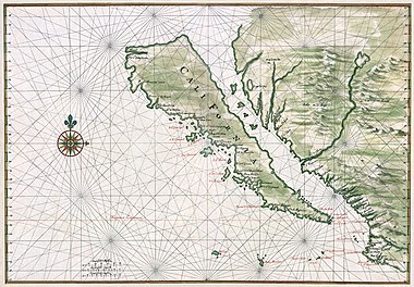 カリフォルニアが島ではなく半島であるという初の探検報告が出たのは1539年だが北西に抜けれたという誤報も続き、探検家がタスマニアやNZにたどり着いた後もカリフォルニア離島説は根強かったので、実は西海岸もあまり大っぴらには見せられない。(画像は1650年代の海図)