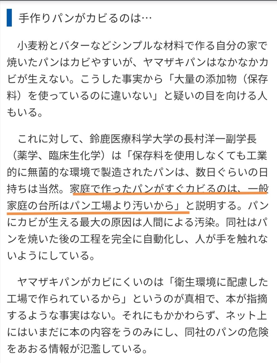 山崎製パンは誠実。「買ってから何もしてないのに腐らない!保存料が!」と言うのを聞くたびに「違うんです…バイト一兵卒まで髪も完全防備、粘着テープによる汚れ取り&除菌ルーム通過、寒いくらいの換気、腰高より下に落ちたものは触らない、複数回の機械掃除、一時間清掃etc」のおかげと言いたい
