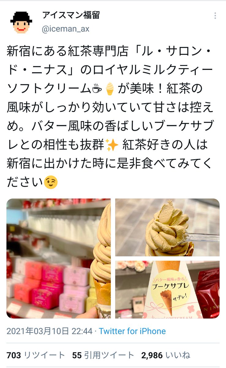 新宿にある紅茶専門店「ル・サロン・ド・ニナス」のロイヤルミルクティーソフトクリーム☕︎🍦が美味!紅茶の風味がしっかり効いていて甘さは控えめ。バター風味の香ばしいブーケサブレとの相性も抜群✨ 紅茶好きの人は新宿に出かけた時に是非食べてみてください😉