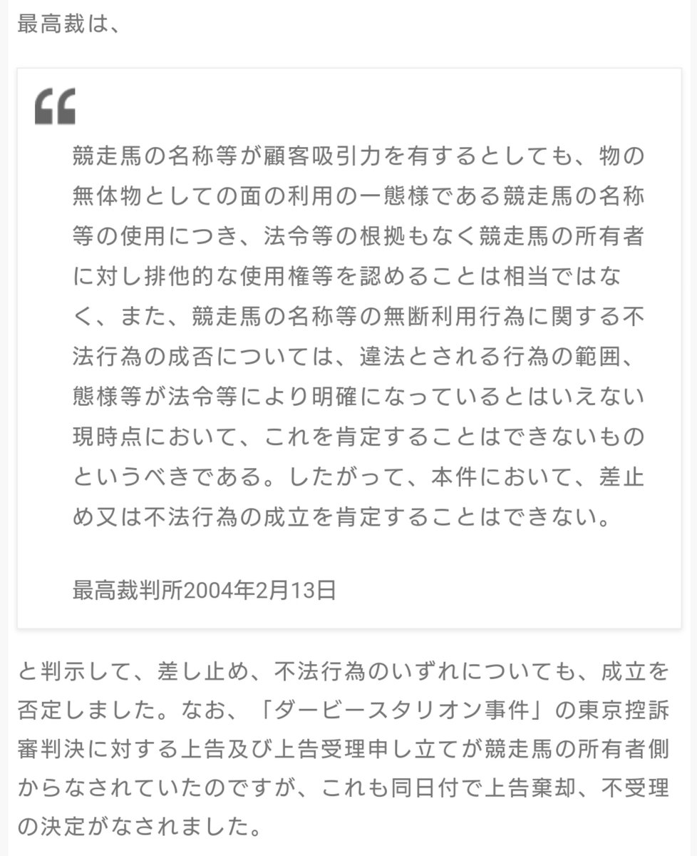 「馬名だけ」なら無断でもいいという見解はあるらしい(昔、馬名について著作権は認められなかったらしい)