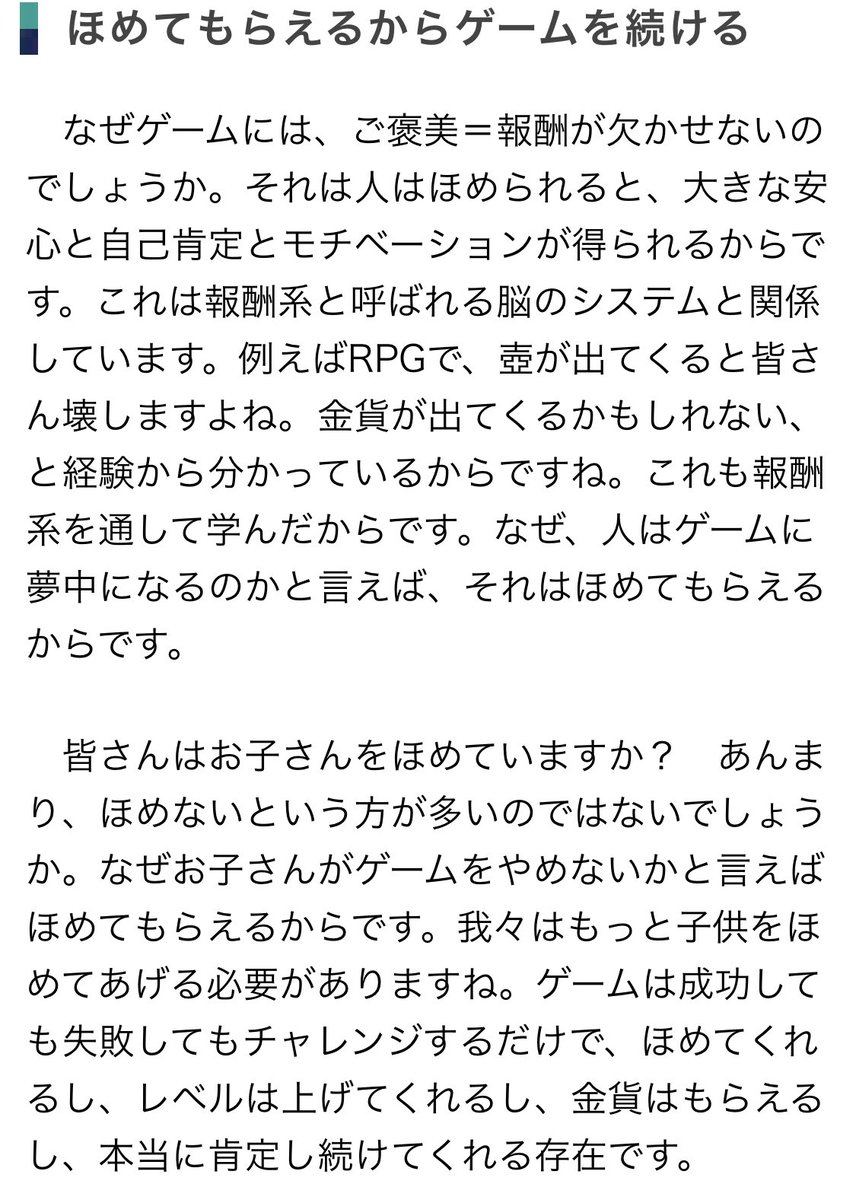 「お子さんがなぜゲームをやめないかというと、ほめてもらえるからです」