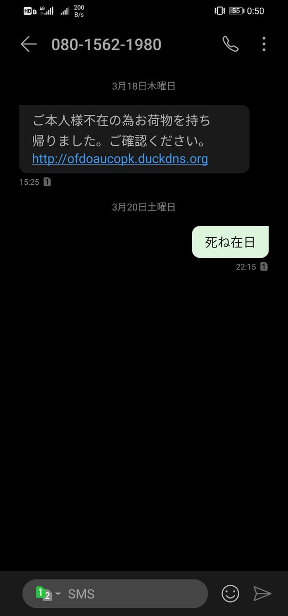 URL先に飛んでアプリをインストールさせられて、その後に電話番号とか抜かれてその番号を勝手に使われて別の人に詐欺メール送るってやつだから返信すると番号抜かれた人にメッセージ来ちゃうんだよね。