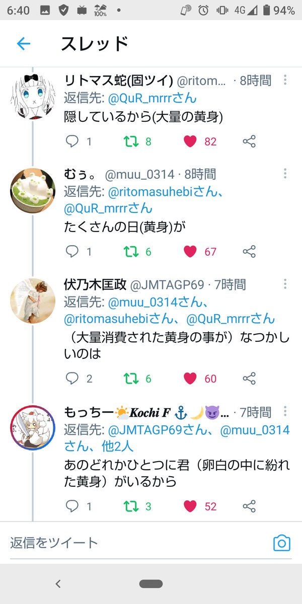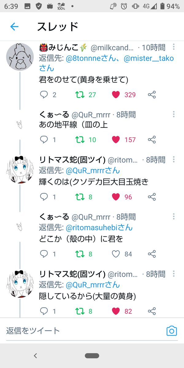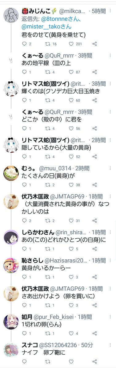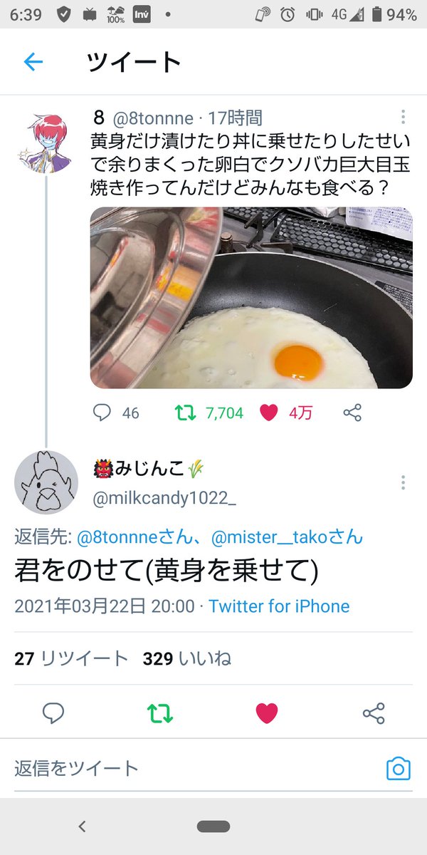 2021.03.22 ツイート maru黄身だけ漬けたり丼に乗せたりしたせいで余りまくった卵白でクソバカ巨大目玉焼き作ってんだけどみんなも食べる 8@8tonnne黄身だけ漬けたり丼に乗せたりしたせいで余りまくった卵白でクソバカ巨大目玉焼き作ってんだけどみんなも食べる?13:17 – 2021年03月22日返信リツイートお気に入り ツイートに対するネットの反応KEISUKE🇨🇭👑ゼレフ@Keisuke_zerehu割る前の卵これじゃね! https://t.co/348LoxChqE14:27 – 2021年03月23日返信リツイートお気に入り御坂 トキヤ@v推し🥕🦋⚓️🦤@TOHO_PEKOTEWI夢の食べ物…14:18 – 2021年03月23日返信リツイートお気に入りとてっちゃん(饕餮)@転移薬師4巻発売中&コミカライズ連載中!@glifindoleほんと好き♡ https://t.co/mdlTXL1Y0w13:55 – 2021年03月23日返信リツイートお気に入りまりあんぬー!@dir_e0u0e白身好き!!! 黄身がいらないわけでもないけど半熟なら好きだけどカッチコチなのはあんまり好きじゃない。。13:50 – 2021年03月23日返信リツイートお気に入り散ったく@takumon_losingo全ビルダーはその黄身、 君にあげるから 残りくれって言うだろうな、、、13:47 – 2021年03月23日返信リツイートお気に入りあやか🌌💎🕺💃🥛💊🌈@ayaka_izm白身フェチの私がウォーミングアップを始めました…\\\\٩( ‘ω’ )و ////(目玉焼きは白身を大量に食べたい派)13:34 – 2021年03月23日返信リツイートお気に入りスペ3@supesan_KC白身好きにはたまらない!!13:31 – 2021年03月23日返信リツイートお気に入りスヤ1いいと思うの@suya511YuAsamiなんだろう ちょっと憧れる13:26 – 2021年03月23日返信リツイートお気に入り Marty@XFA_39Eどんぶりに白身も載せる13:19 – 2021年03月23日返信リツイートお気に入り澤村求深@SWMRMTMsattouを感じる13:15 – 2021年03月23日返信リツイートお気に入り🧟♀️步 步 🐾☁@M1zuno_Tadakuni白身大好き人間だからめちゃくちゃ食いたい13:13 – 2021年03月23日返信リツイートお気に入り星みづき@miduki_hsこういう手があったか! (目玉焼きは白身が好き)12:47 – 2021年03月23日返信リツイートお気に入りくろすけ@借金:残り345万@96_chronicleん?ビルダーかな?12:38 – 2021年03月23日返信リツイートお気に入りArango@Kiguchifalconめちゃくちゃボディビルダーの飯でワロタ12:34 – 2021年03月23日返信リツイートお気に入り澪音=レーヴェ(佳子)🐾ねこになりたい@Rain_Evhemary_目玉焼きは白身のほうが好きだから食べたい!12:30 – 2021年03月23日返信リツイートお気に入り トト🐠💕3/24〜世界世界選手権🕺💃⛸✨✨@totolove37白身大好きな私には至福…🍳✨12:30 – 2021年03月23日返信リツイートお気に入りともち🍵🍡@t_tomoko_i私、白身大好き❤食べる!12:29 – 2021年03月23日返信リツイートお気に入り👁️🗨️ 春巻き👁️🗨️@hrmk_wotaぐりとぐらみたいな世界観12:17 – 2021年03月23日返信リツイートお気に入り冷茶猫(Chacold)@MegmYosizm極小キロバイト宣言でこんなのたくさん倒した()12:14 – 2021年03月23日返信リツイートお気に入り斎藤m:e@saito_mie夢のような食べ物すぎる12:13 – 2021年03月23日返信リツイートお気に入りかくてる@kakutelu1257こんだけ白身あったらメレンゲにしてケーキ作りたい11:59 – 2021年03月23日返信リツイートお気に入り緋焔@ひえん@HienVariel三白眼焼き……11:53 – 2021年03月23日返信リツイートお気に入り 左葛メイヤ@GerutoYale黄身だけ通常サイズなの草w11:37 – 2021年03月23日返信リツイートお気に入りK->@K_fcmグラディウスに出てくるやつですか?11:32 – 2021年03月23日返信リツイートお気に入りjade@gerrykin卵ふわふわにしたら良いのに。11:16 – 2021年03月23日返信リツイートお気に入りカカオ@GABA_Saltmilk白身はたんぱく質が豊富だからよく食べるビルダーがいると聞いたことが11:10 – 2021年03月23日返信リツイートお気に入りふぇりる@Feriru_1202使い道に困ったのは分かるけどそうはならんやろw11:09 – 2021年03月23日返信リツイートお気に入り醤油瓶@soybean_shouyu最高じゃん✌️11:09 – 2021年03月23日返信リツイートお気に入りヒノイ@妖怪『オフトゥンおいてけ』@hinoixヘルシー目玉焼き(割合)10:52 – 2021年03月23日返信リツイートお気に入りkeystone(DES_pro)@LightZantei白身だけでカニ玉作るとウマイ10:34 – 2021年03月23日返信リツイートお気に入りメスイキにゃんこANZ@az_create_0黄身だけつかうのあるあるにゃ。10:33 – 2021年03月23日返信リツイートお気に入りゆりあん@とりま固ツイのツリーは読んでな😁✌️@Yurian3104ちょっとスゴすぎる🍳10:28 – 2021年03月23日返信リツイートお気に入りばるす【かもく:ちょくせん~せんかい】@BALUS_Dagron_JPま卵白あまったらラングドシャ作るのが一番簡単な気がする10:13 – 2021年03月23日返信リツイートお気に入り全日本目玉焼き学会@medamayaki_net白身も美味しいよ。09:56 – 2021年03月23日返信リツイートお気に入りぱんだ@usatama2019白身の方が好きだからこれ理想!09:56 – 2021年03月23日返信リツイートお気に入りくろとりはち@kurohacciリプ欄面白過ぎた09:55 – 2021年03月23日返信リツイートお気に入りさぼりん@strawberryface2白身が好きな人にはご褒美🤤09:20 – 2021年03月23日返信リツイートお