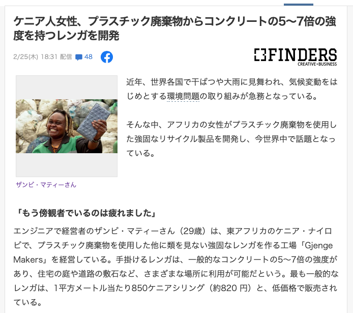 ケニア人女性、プラスチック廃棄物からコンクリートの5~7倍の強度を持つレンガを開発(FINDERS)