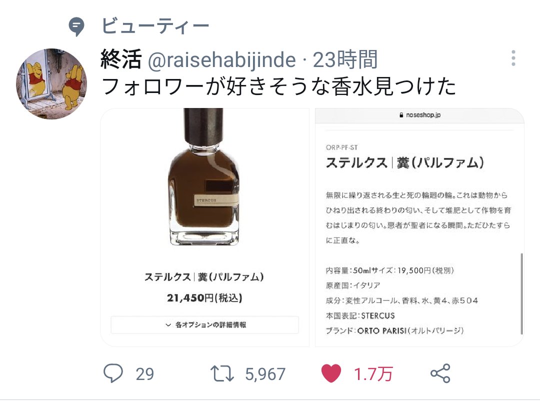 2021.03.23 ツイート maruフォロワーが好きそうな香水見つけた 終活@raisehabijindeフォロワーが好きそうな香水見つけた 13:19 – 2021年03月23日返信リツイートお気に入り ツイートに対するネットの反応Y.K@SERI@Yukino_Seriこれ何処に需要があるのか教えて欲しいwww11:09 – 2021年03月25日返信リツイートお気に入りDr.P@lifesch_doc_P岡山の県北でドバーしそう22:02 – 2021年03月24日返信リツイートお気に入りtakkun@takuya1220ryuji仕事終わりの匂いやん21:56 – 2021年03月24日返信リツイートお気に入り🎄ンババ🎄@nbaba_foever何が起きた21:43 – 2021年03月24日返信リツイートお気に入り蒼希れみ🌶🌟8月スタイリングイベ🌟@Remi_R_0811糞。21:37 – 2021年03月24日返信リツイートお気に入りなつ@70HKentどうして作ろうとした(ためにならないTwitterの情報好例21:27 – 2021年03月24日返信リツイートお気に入りゆんたん大佐@yuntantaisaこれはいいものだ21:01 – 2021年03月24日返信リツイートお気に入りろくのあ@3/25🗣️@6no_a中学校に好き嫌い別れそうな香水持ってきた男子いて『うんこうすい』って言われてたの思い出した20:29 – 2021年03月24日返信リツイートお気に入り kikurin.@kikurin0403「ただひたすらに正直な。」www20:22 – 2021年03月24日返信リツイートお気に入りはるきのこ@Unix1211これで糞虫採るか20:21 – 2021年03月24日返信リツイートお気に入りRYO@ピンクの淫獣@SpankTheMonkyスモーキー、そしてスパイシー(意味深)20:19 – 2021年03月24日返信リツイートお気に入りRYO@ルーシェ×マシュマロ×ししまる@RyoTonkスモーキー そしてスパイシーwww20:17 – 2021年03月24日返信リツイートお気に入りEvangeline a.k.a Villain@Eva_Villainウンコ塗ってろ!20:01 – 2021年03月24日返信リツイートお気に入りモッさんP@sergeantMossan「フン」と読むのか「クソ」と読むのか19:51 – 2021年03月24日返信リツイートお気に入りたかはし@takaha4yy糞(eau de toilette)の方が、字面としては臭そうでしょうか…19:47 – 2021年03月24日返信リツイートお気に入り 米印@urofreeこのうんこ2万もするぅ… 高級なうんこだ…18:34 – 2021年03月24日返信リツイートお気に入りタァピォカUSAGI🐰✨@Tapioca_USAGIすげぇな、、。18:03 – 2021年03月24日返信リツイートお気に入り化粧語録💋化粧と私✨🌈✨@keshougorokuすごいなこれ…17:46 – 2021年03月24日返信リツイートお気に入り永久市民@eikyuusiminうんこをここまで表現出来る語彙力すげえよ16:04 – 2021年03月24日返信リツイートお気に入りゆず文房具店 店長ゆず@狩猟笛@yuzu_tencho3なにこれwwww16:00 – 2021年03月24日返信リツイートお気に入りaz@az21155866凄い香水あるんだな😳しかもめっちゃ高い…悪者が聖者になる瞬間って表現神すぎでしょ😂😂😂15:35 – 2021年03月24日返信リツイートお気に入りニウェル@ゴルシちゃん🦄@S8Niwwelくーっ 高いな……15:30 – 2021年03月24日返信リツイートお気に入り 雛菊@akifukuhanaこのブランドやばくねえかwww15:27 – 2021年03月24日返信リツイートお気に入りカナダリス@kanadarisu3案の定リプ欄に唐沢居て草w15:10 – 2021年03月24日返信リツイートお気に入り꧁りりあ꧂@RiriaIoniaこれ嗅いだことあるけどほんとに動物の糞っぽい香りしたそのものではなく多少おしゃれだけど糞の範疇ではあった14:58 – 2021年03月24日返信リツイートお気に入りわし@taAPEIi2eMXmNTGやったぜ。投稿者:14:58 – 2021年03月24日返信リツイートお気に入り梟@C6H6xhttps://t.co/fOQoLic0BF ここから買えるよ14:31 – 2021年03月24日返信リツイートお気に入りre:EGUZERA(えぐちゃん)@EGU88610pester説明書バカかっこよくて草14:29 – 2021年03月24日返信リツイートお気に入りV@NdI8uひねり出される…14:20 – 2021年03月24日返信リツイートお気に入りくぴ@cupopi遅めの昼食ってるときにTLで見かけてもうだめぽ14:15 – 2021年03月24日返信リツイートお気に入りぱらき@paraki99良さがある14:13 – 2021年03月24日返信リツイートお気に入りみそまる💫@666_hikan_999これ、うんこの香水ってことか…???🤔💩🤔💩🤔💩14:06 – 2021年03月24日返信リツイートお気に入り株式(人脈ブロンズから抜けたい)@KABUSHIKI_mp4ただひたすらに正直な悪者が聖者になる瞬間をドバーッと出してきた。14:06 – 2021年03月24日返信リツイートお気に入りytr-1454/孤影衆 鴉羽@YTR_kaixaまじで臭13:50 – 2021年03月24日返信リツイートお気に入り尾上新は勝つ@punpun6767nose shopニッチすぎるな13:47 – 2021年03月24日返信リツイートお気に入り太陽拳@しお団🐈🧂@taiyouken_girl欲しいなw13:47 – 2021年03月24日返信リツイートお気に入り向水 きんとら@4/24@mukomizuテキスト好きすぎる。13:23 – 2021年03月24日返信リツイートお気に入りぞう@zoudazouもはや兵器やないか13:17 – 2021年03月24日返信リツイートお気に入りすこ@suko0125lこんなんつける人おらんやんww13:06 – 2021年03月24日返信リツイートお気に入りうますた@uma_style雲国際のかな。13:03 – 2021年03月24日返信リツイートお気に入りヨシュア🐾🐾🐾@S_BanditV竜涎香だと思いたい…13:02 – 2021年03月24日返信リツイートお気に入りX@xy62ZNuビューティーで草 https://t.co/oXeKTxdeAJ12:58 – 2021年03月24日返信リツイートお気に入りあ