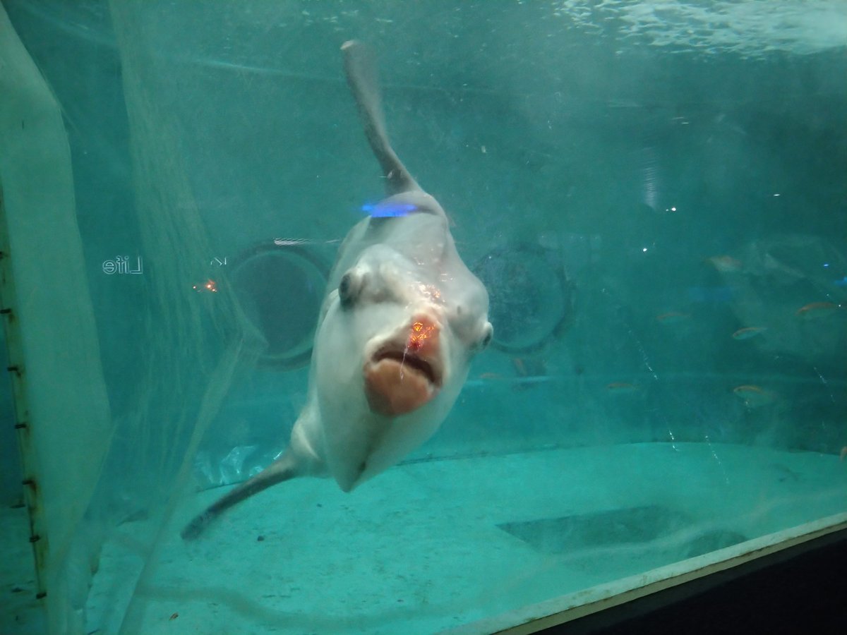 水槽の壁で擦ることでくちびるが腫れ、たらこ唇になる。 実は野生のマンボウはたらこ唇ではない。