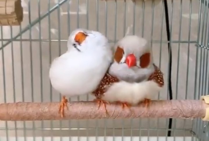 キンカチョウもかわいい‥‥。そら豆みたいになってるのは首の下を隣の彼に羽繕いして欲しかったんだね。もっとやってほしかったのに塩対応だったからどっか行っちゃったけど、マイペースなオスの方もかわいい(´•⌔•`)