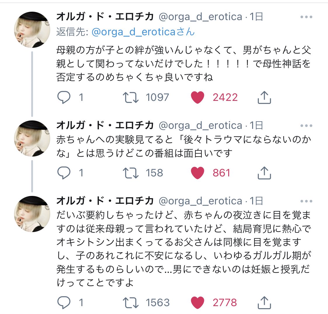 Netflix「赤ちゃんを科学する」シーズン1の1回、母子の絆を高めるホルモンのオキシトシン量について検査した後、ゲイカップルなど「母親のいない親子」に同じ検査をして「熱心に育児してる父子の分泌するオキシトシン量は同じ」と。母性神話を否定して「熱心な育児が親子の絆を生む」としてて良かった