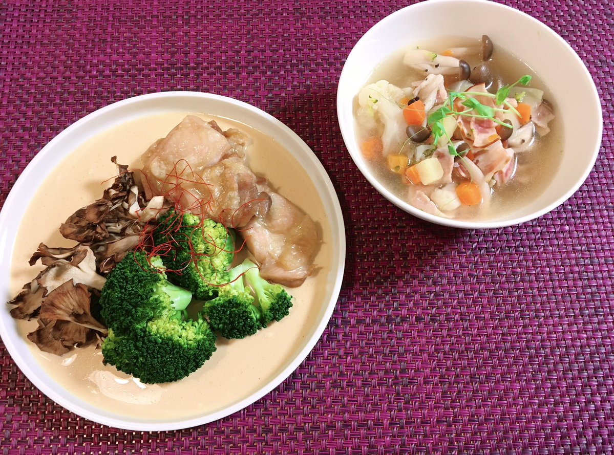 きょうの夕食は #オッケーブロッコリー です。メインはブロッコリー🥦なので鶏肉や舞茸は付け合わせですから気にしないでください。