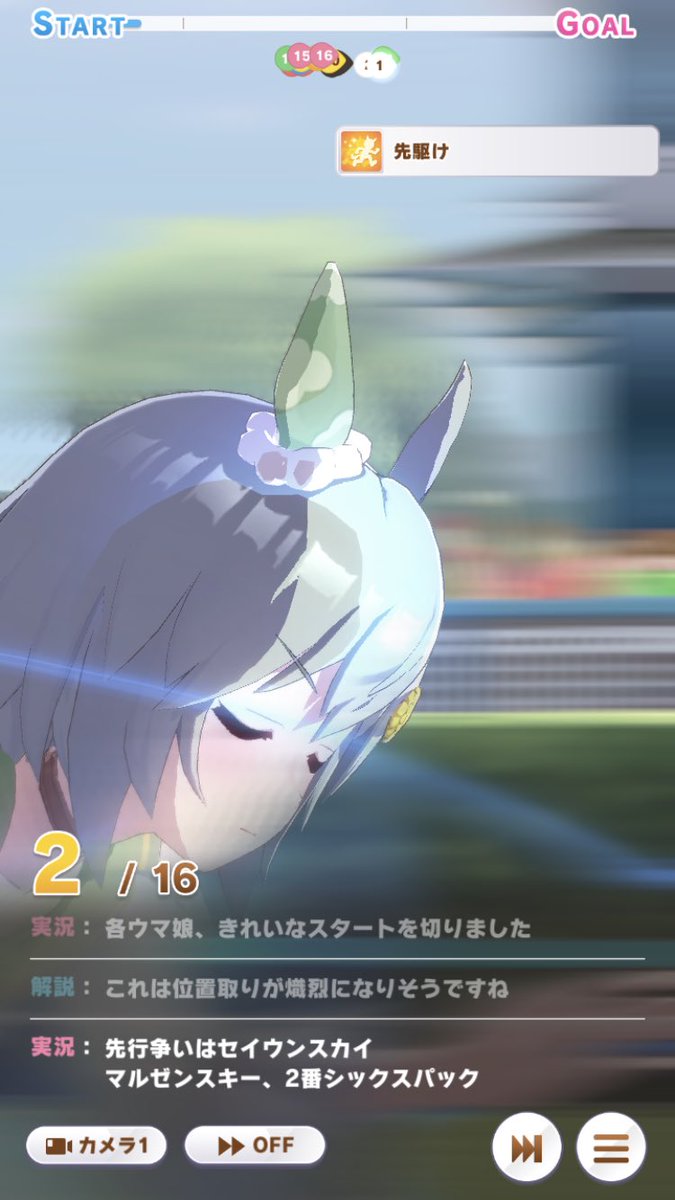 普段ふわーっとしてる子の、内に秘めた闘争心が滲み出てるところが堪らんです、いい表情だなあ。早く育成したいなセイウンスカイ。