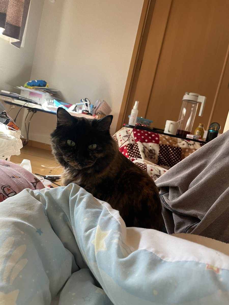 姫宮様もデスクの足元に置いてあるベッドでお休みになって、時々私が手を伸ばして触れると「グルルルルン」と返事してくださいます。
