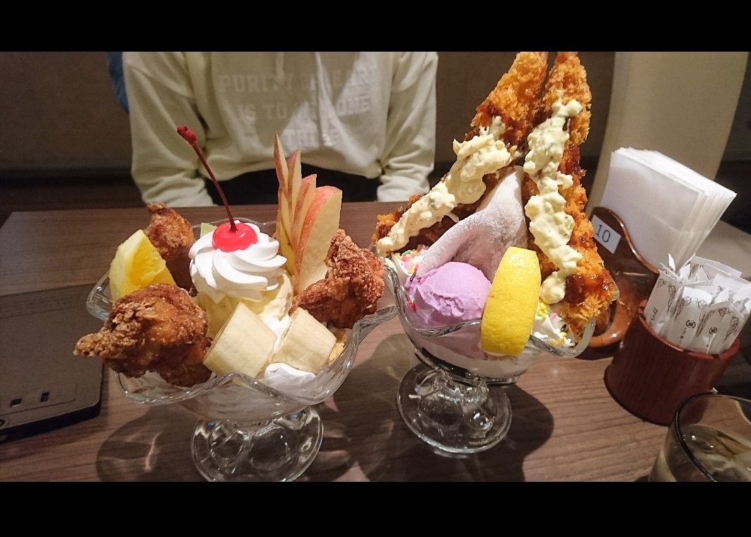 唐揚げパフェとかエビフライパフェもあるからオススメ、見た目あれだけど意外といける( ‘ч’ )