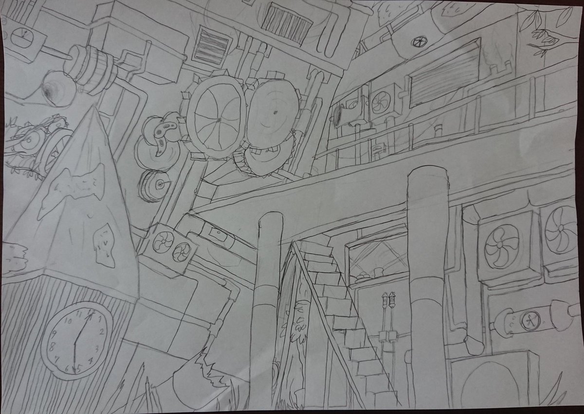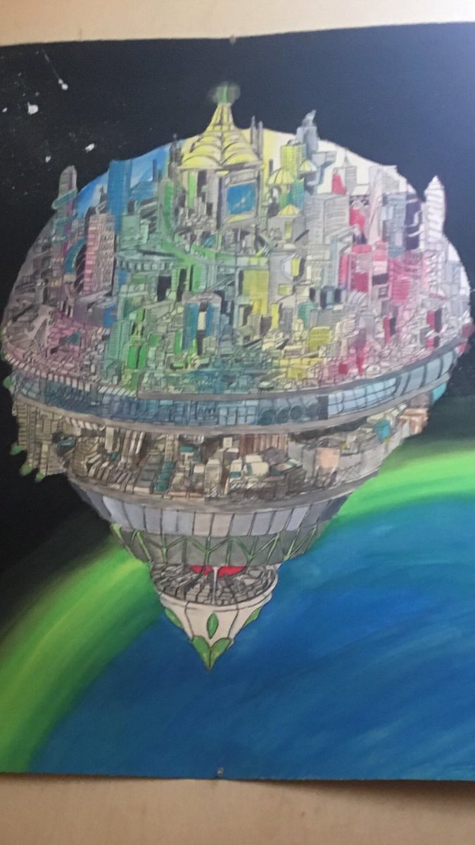 制作風景の写真が出てきました。 下書きをせず、端っこから思いつくままに空想の街を描いていきます。