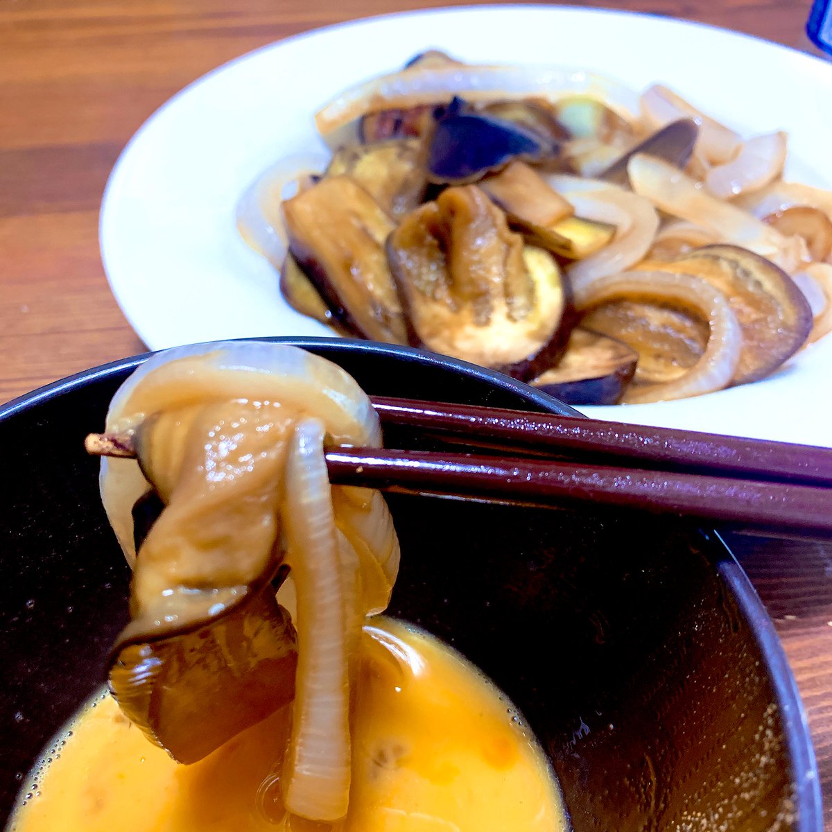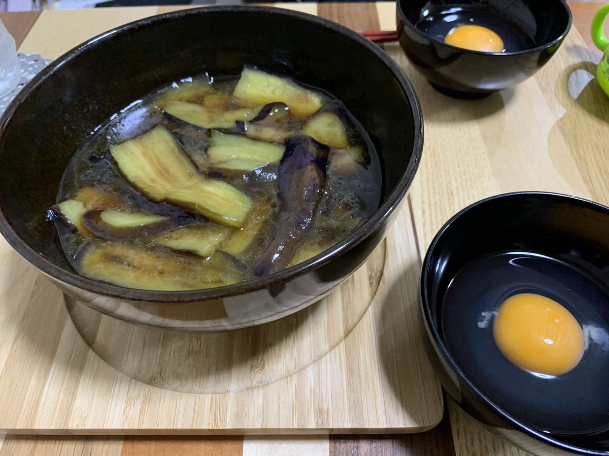 溶き卵をつけてどうぞ、トロトロの甘辛茄子と卵が絡み相当旨いです