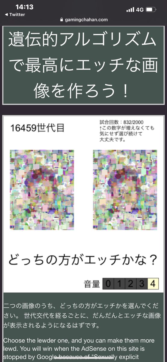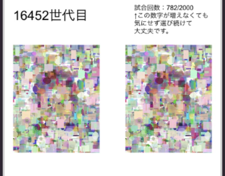 2021.05.16 ツイート maruいつの間にか2~3枚目のような溶け方を経て、現在は4枚目のような形に再形成されていってる…。 楓蛙@kaede_gaeruなんとなく最近見守ってた遺伝的アルゴリズムちゃんが、昨日の時点では1枚目みたいな状態だったのに、いつの間にか2~3枚目のような溶け方を経て、現在は4枚目のような形に再形成されていってる…。 07:00 – 2021年05月16日返信リツイートお気に入り ツイートに対するネットの反応而今みらい 🅙@mirai_cosplay遺伝的アルゴリズムちゃん….野獣先輩なのでは⁉️ https://t.co/OUr6uZI13c 14:16 – 2021年05月17日返信リツイートお気に入り武蔵:デブリミット9200rpm@SINTK_DHU14th5/17 14:03現在 美少女というよりはインターネットで最も汚いアレに見えてくる… https://t.co/VMKKumRrz814:03 – 2021年05月17日返信リツイートお気に入り