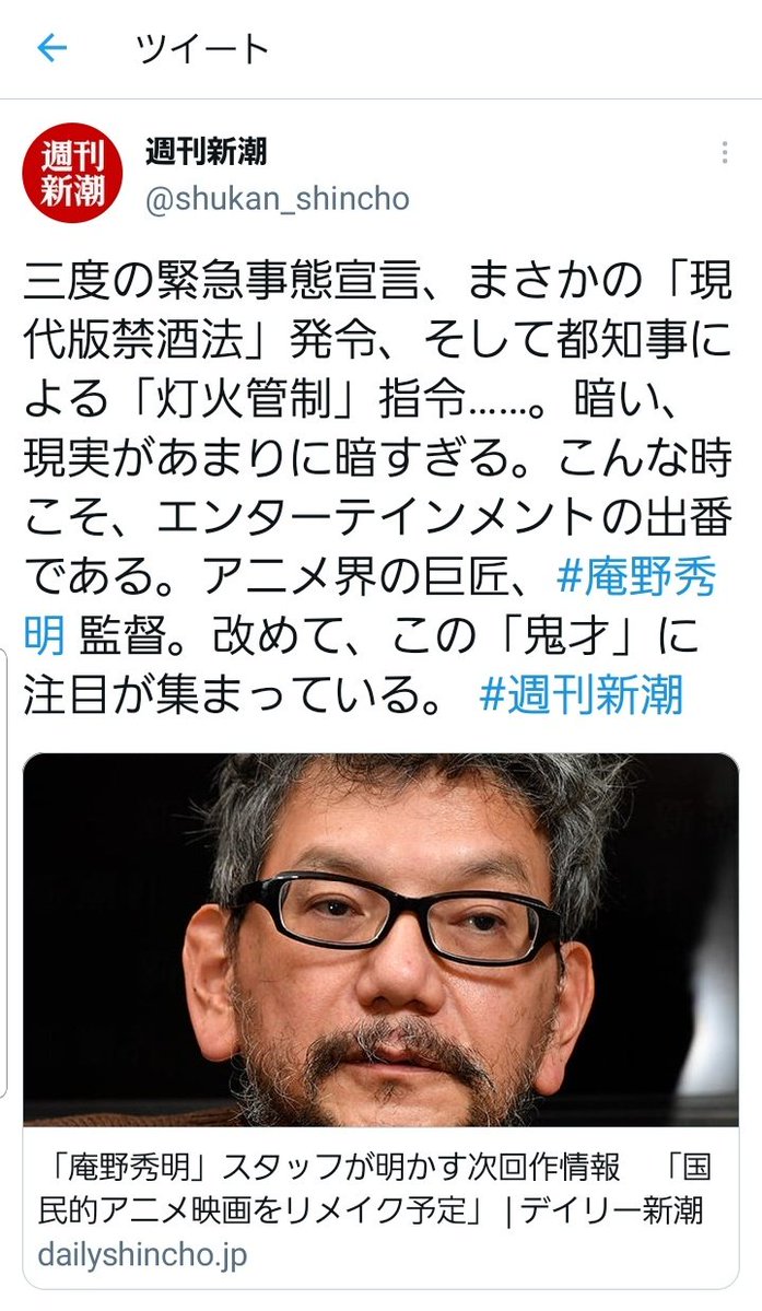 “株式会社カラー on Twitter: “現在、庵野秀明がアニメ作品の企画をしているという内容についてのニュース記事が出ていますが、そのような事実はございません。 また、弊社関係者はこのような週刊誌やネット記事に対し、過去も現在も一切の取材を受けておりません。 正式に…”