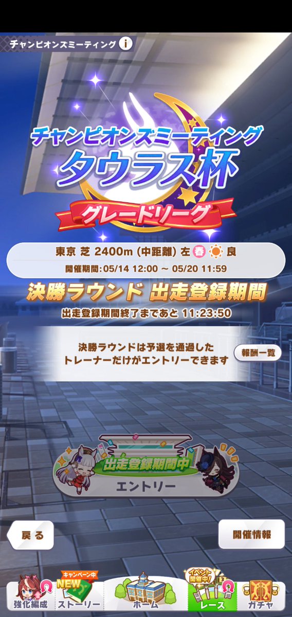タウラス杯、割と不評のようだけど自分はオープンリーグ(下のクラス)で上限のB育成(専用育成でなく上を目指して敗退して結果B、専用勝負服ですらない)で割と勝てた。ゴルシの勝率が6割程度でごくたまにキング(2勝)ネイチャ(1勝)という感じ。運が良かったのかな?決勝に進めてる。