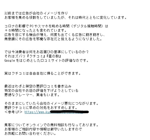 最近うちや他の歯医者さんもそうだけど、クソ業者がGoogleマップの評価に星1評価かつ適当な事を書き込みした後電話かかってきて、いくらで評価取り消しますという事が横行してます。